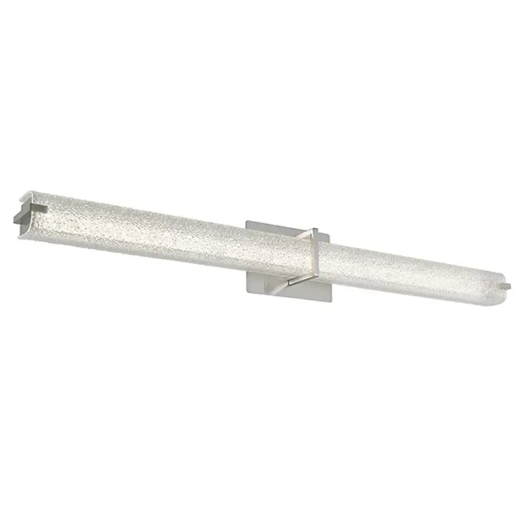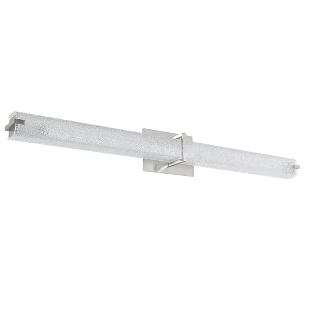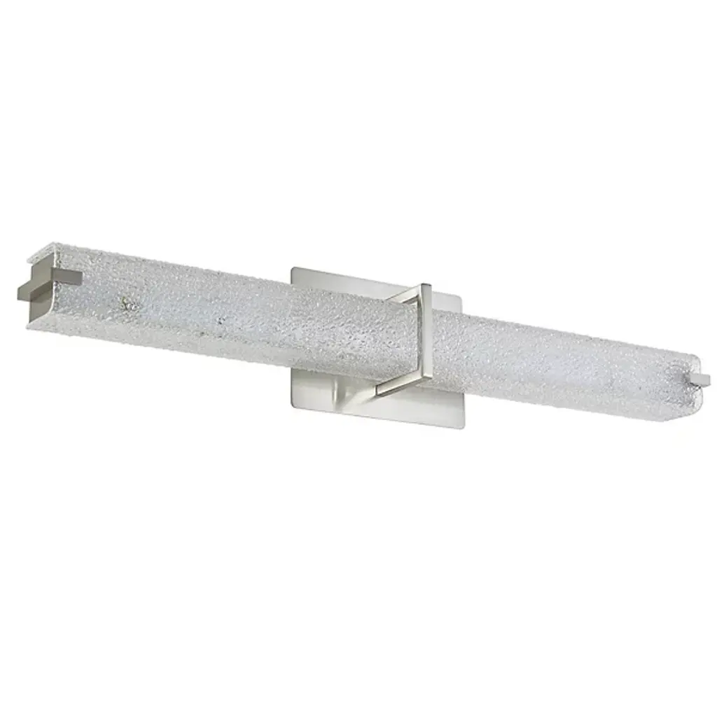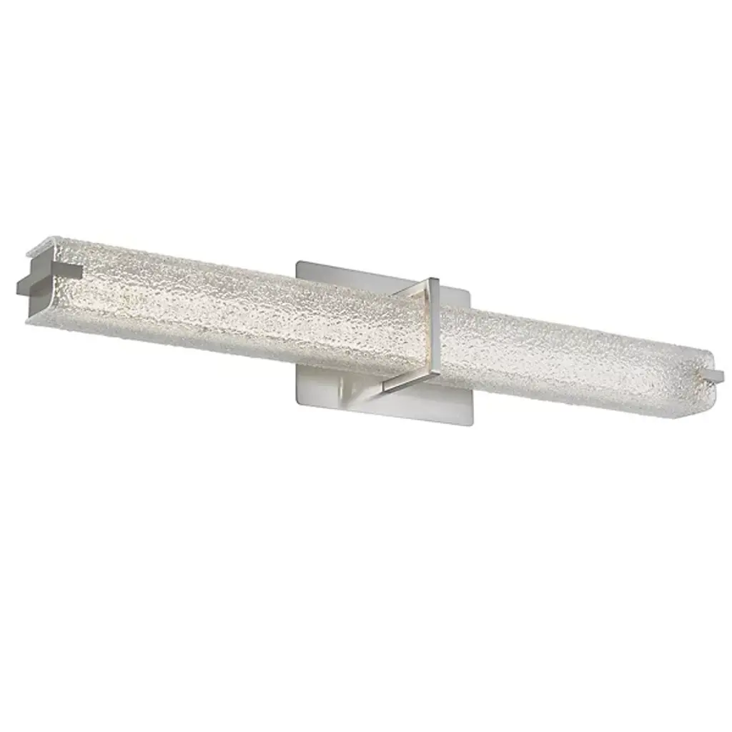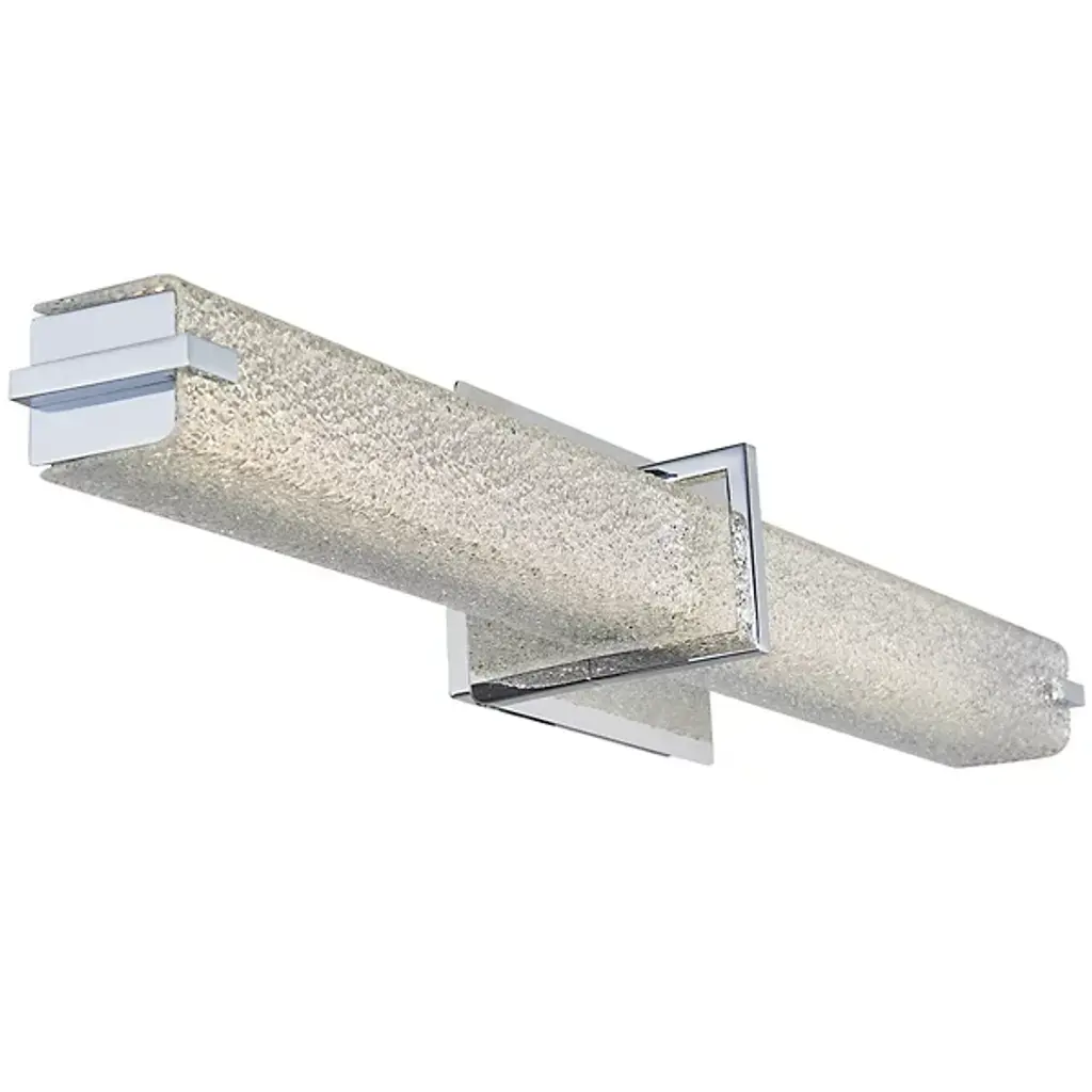 The Squire LED Vanity Light by Abra Lighting lends a dazzling touch to master and guest bathrooms alike. With a rectangular piece of an artisan-crafted water glass, this glamorous piece softens an energy-efficient source of light and has rounded corners that sit beautifully in the crisp, squared metal brackets and center detail that support it. Anchored by a sleek, square backplate, this elegant bath bar can be installed in a vertical or horizontal orientation to accent spaces while providing a lovely layer of illumination.