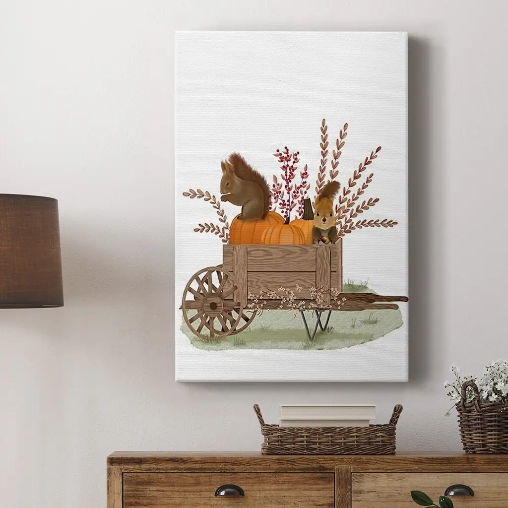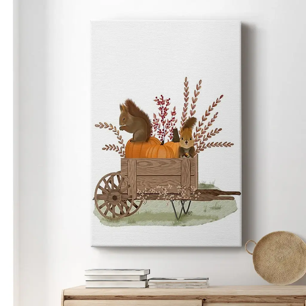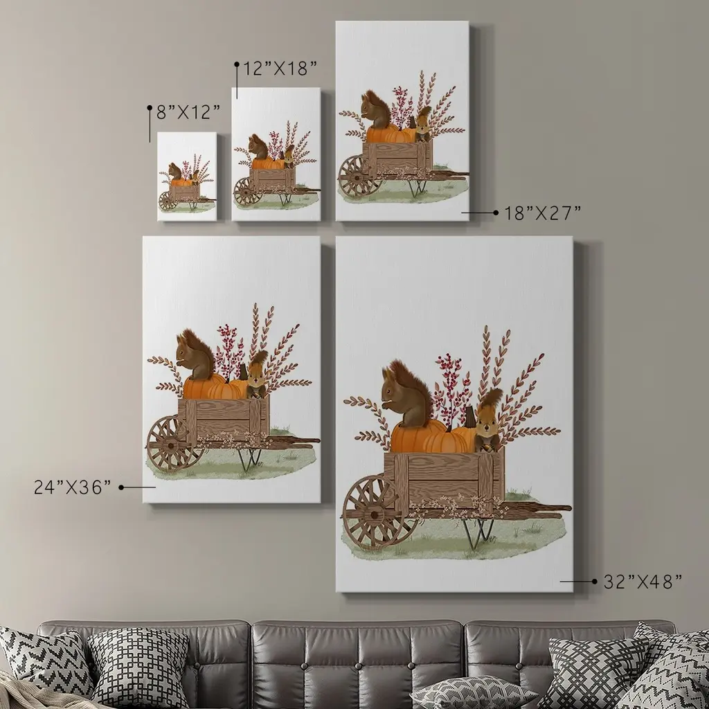 Squirrels In Pumpkin Wheelbarrow Premium Gallery Wrapped Canvas - Ready to Hang A premium hand stretched gallery wrapped canvas print created to last. Featuring a beveled a solid wood stretcher bar, each piece comes ready to hand 6 SIZES AVAILABLE 8''X12'' - Overall Size 12''X18'' - Overall Size 18''X27'' - Overall Size 24''x36'' - Overall Size 32''x48'' - Overall Size 40''x60'' - Overall Size Each piece is made to order. Built to Last Each piece comes ready to hang Solid wood stretcher Fade and Water resistant Made domestically