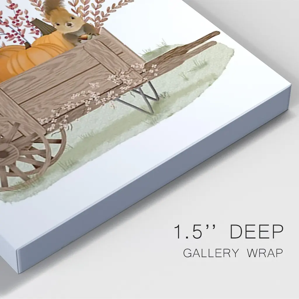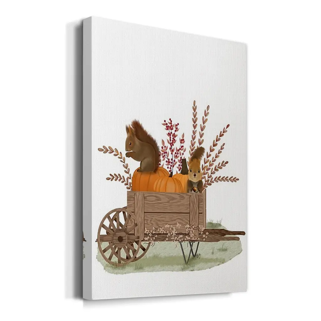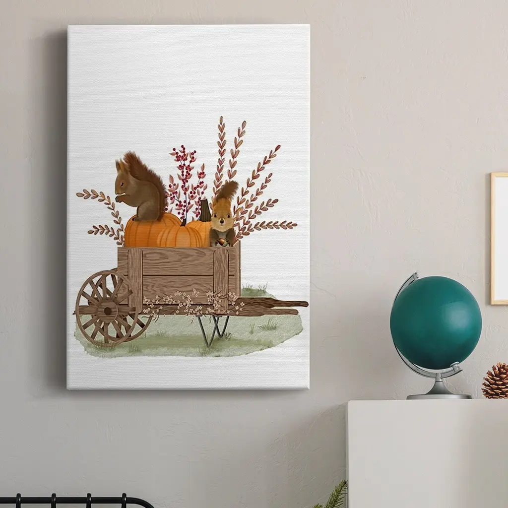 Squirrels In Pumpkin Wheelbarrow Premium Gallery Wrapped Canvas - Ready to Hang A premium hand stretched gallery wrapped canvas print created to last. Featuring a beveled a solid wood stretcher bar, each piece comes ready to hand 6 SIZES AVAILABLE 8''X12'' - Overall Size 12''X18'' - Overall Size 18''X27'' - Overall Size 24''x36'' - Overall Size 32''x48'' - Overall Size 40''x60'' - Overall Size Each piece is made to order. Built to Last Each piece comes ready to hang Solid wood stretcher Fade and Water resistant Made domestically