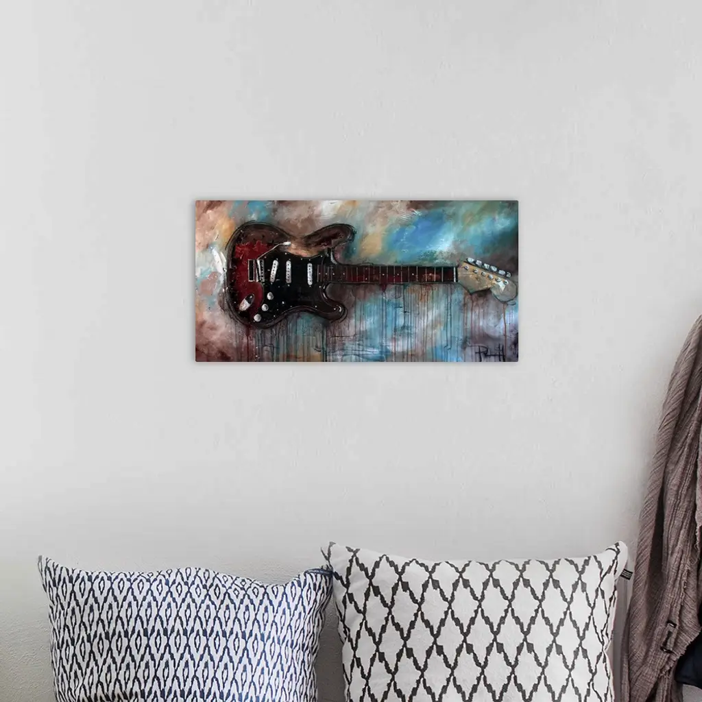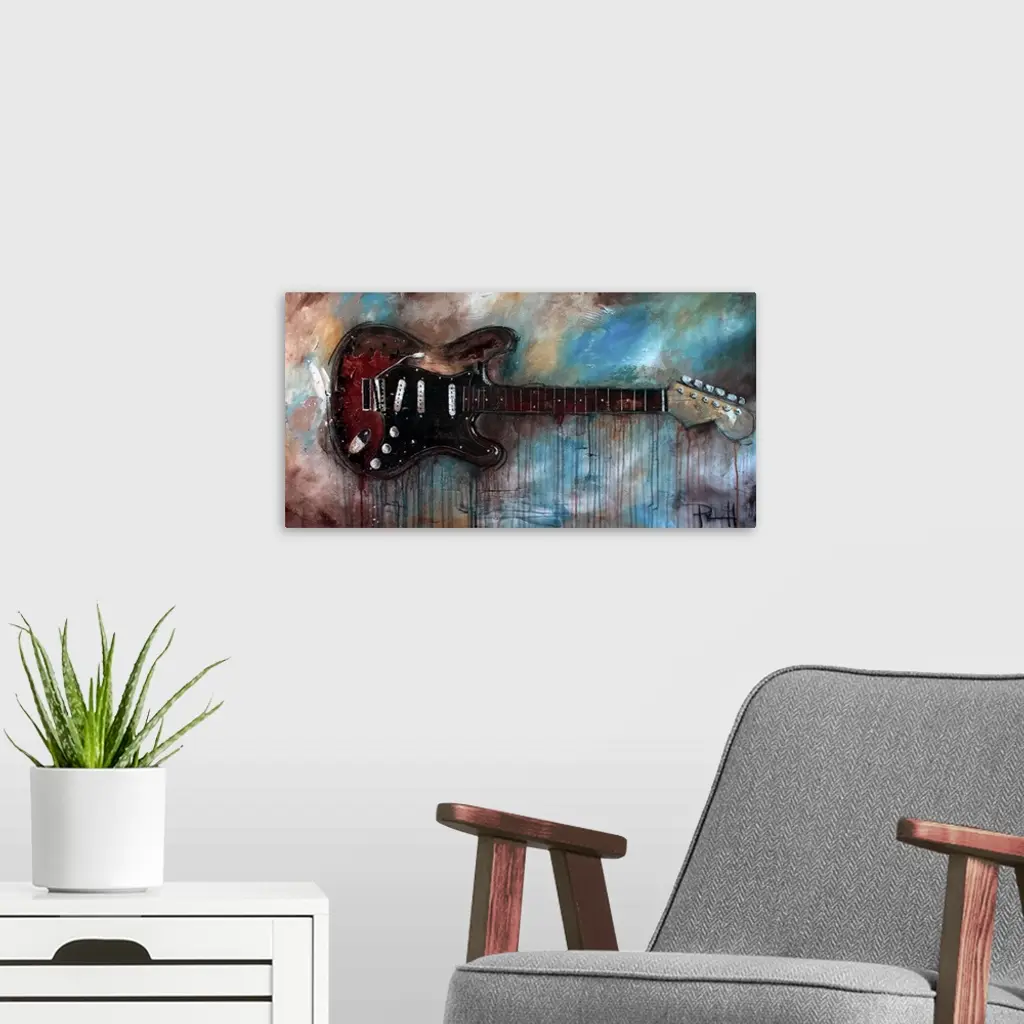 Painting of a red electric guitar on an abstract background.