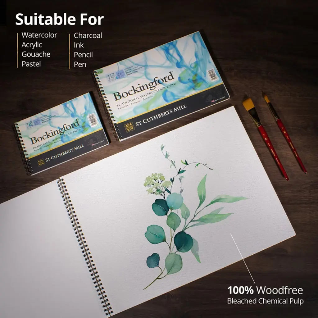 St Cuthberts Bockingford Watercolor Pad, Cold Pressed, Spiral Binding, 140lb/300gsm, 12 Sheet, 7x10 inch, Pack of 2 | Experience the magic of Bockingford® — a stunning English watercolor paper crafted with tradition & precision at St Cuthberts Mill. Created on a classic cylinder mould machine, this high-quality paper is made from pure, archival-grade materials, ensuring your artwork stands the test of time. The unique, random texture of Bockingford® comes from natural woolen felts, making each sheet a tactile delight. Its exceptional color-lifting abilities & forgiving nature make it a dream canvas for both seasoned pros & aspiring artists alike. Bockingford® brings you premium watercolor paper without the premium price tag, offering the perfect balance of quality & affordability. Unlock your creativity & let your art shine on a surface designed for brilliance! For centuries, St Cuthberts has honed the art of papermaking. Our legacy, combined with one of the world's rare cylinder mould machines, crafts papers of unparalleled quality. We commit to using only the purest raw materials, ensuring our archival papers meet the highest standards. Specially sourced pulps, cotton linters & woolen felts create surface textures that are as unique as they are exquisite. It's no wonder that artists around the globe choose St Cuthberts for their masterpieces. Bockingford® is a stunning English watercolor paper crafted with care & meticulously made from pure materials to archival standards, its beautiful surface is achieved through natural woolen felts, creating a unique, random texture that artists adore. Renowned for its superb color lifting properties, Bockingford® is a favorite among both professionals & enthusiasts for its forgiving nature. Sold as a pack of 2.