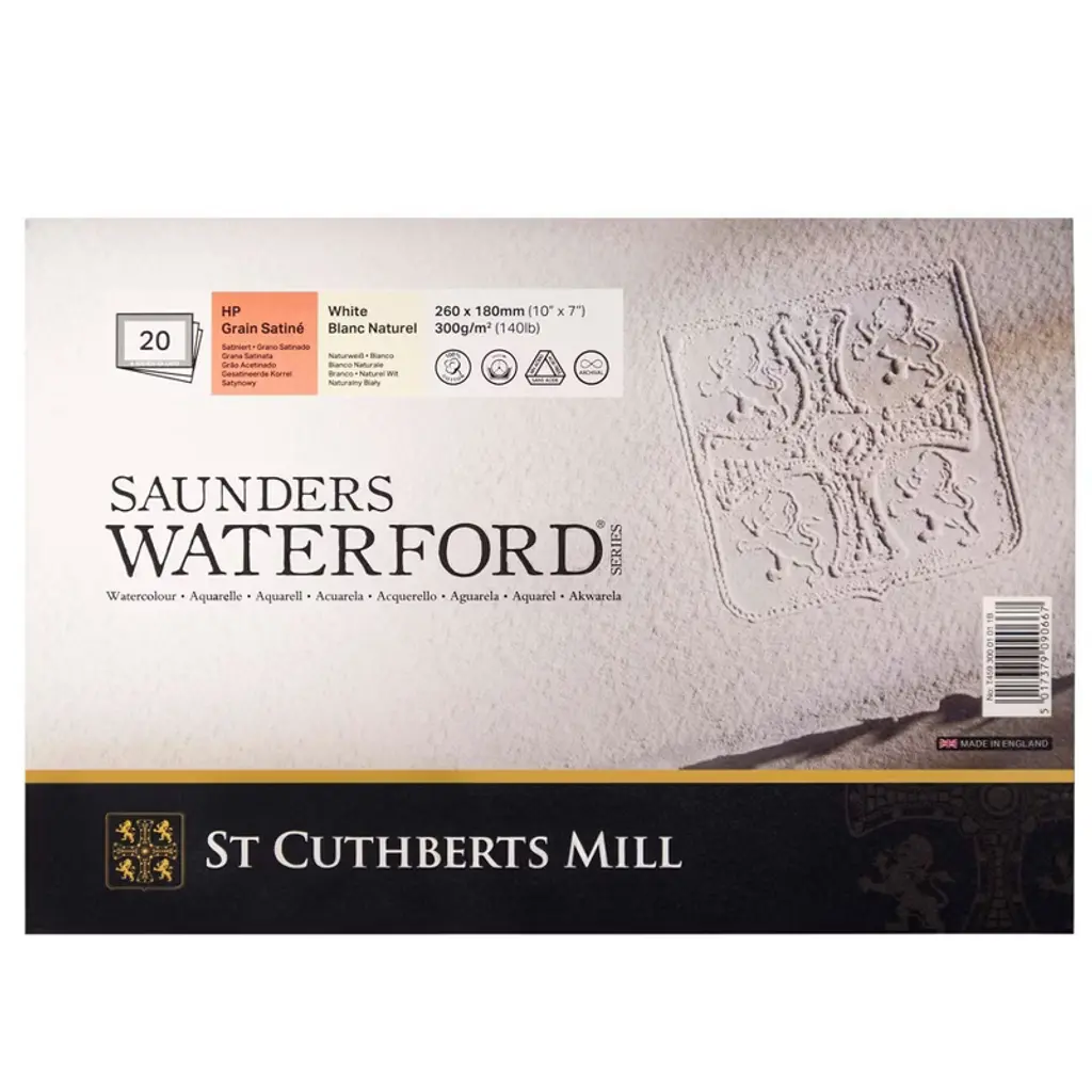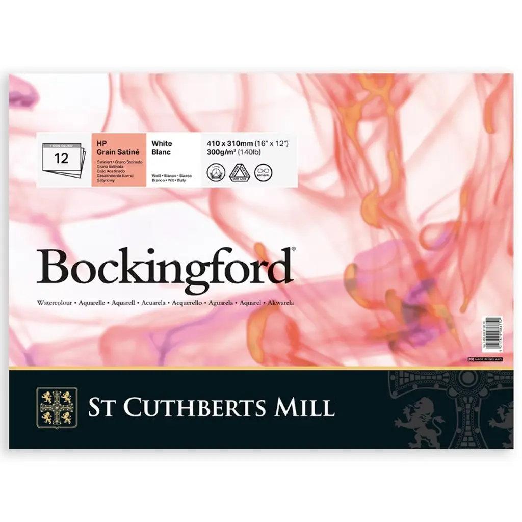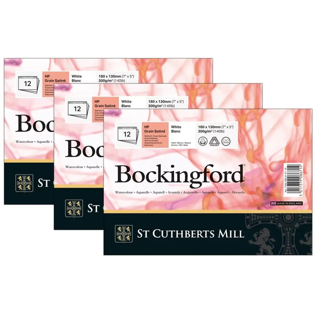 St Cuthberts Bockingford Watercolor Pad, Hot Pressed, White, Glue Binding, 140lb/300gsm, 12 Sheet, 7x10 inch, 1 Count | Experience the magic of Bockingford® — a stunning English watercolor paper crafted with tradition & precision at St Cuthberts Mill. Created on a classic cylinder mould machine, this high-quality paper is made from pure, archival-grade materials, ensuring your artwork stands the test of time. The unique, random texture of Bockingford® comes from natural woolen felts, making each sheet a tactile delight. Its exceptional color-lifting abilities & forgiving nature make it a dream canvas for both seasoned pros & aspiring artists alike. Bockingford® brings you premium watercolor paper without the premium price tag, offering the perfect balance of quality & affordability. Unlock your creativity & let your art shine on a surface designed for brilliance! For centuries, St Cuthberts has honed the art of papermaking. Our legacy, combined with one of the world's rare cylinder mould machines, crafts papers of unparalleled quality. We commit to using only the purest raw materials, ensuring our archival papers meet the highest standards. Specially sourced pulps, cotton linters, & woolen felts create surface textures that are as unique as they are exquisite. It's no wonder that artists around the globe choose St Cuthberts for their masterpieces. Bockingford® is a stunning English watercolor paper crafted with care & meticulously made from pure materials to archival standards, its beautiful surface is achieved through natural woolen felts, creating a unique, random texture that artists adore. Renowned for its superb color lifting properties, Bockingford® is a favorite among both professionals & enthusiasts for its forgiving nature.