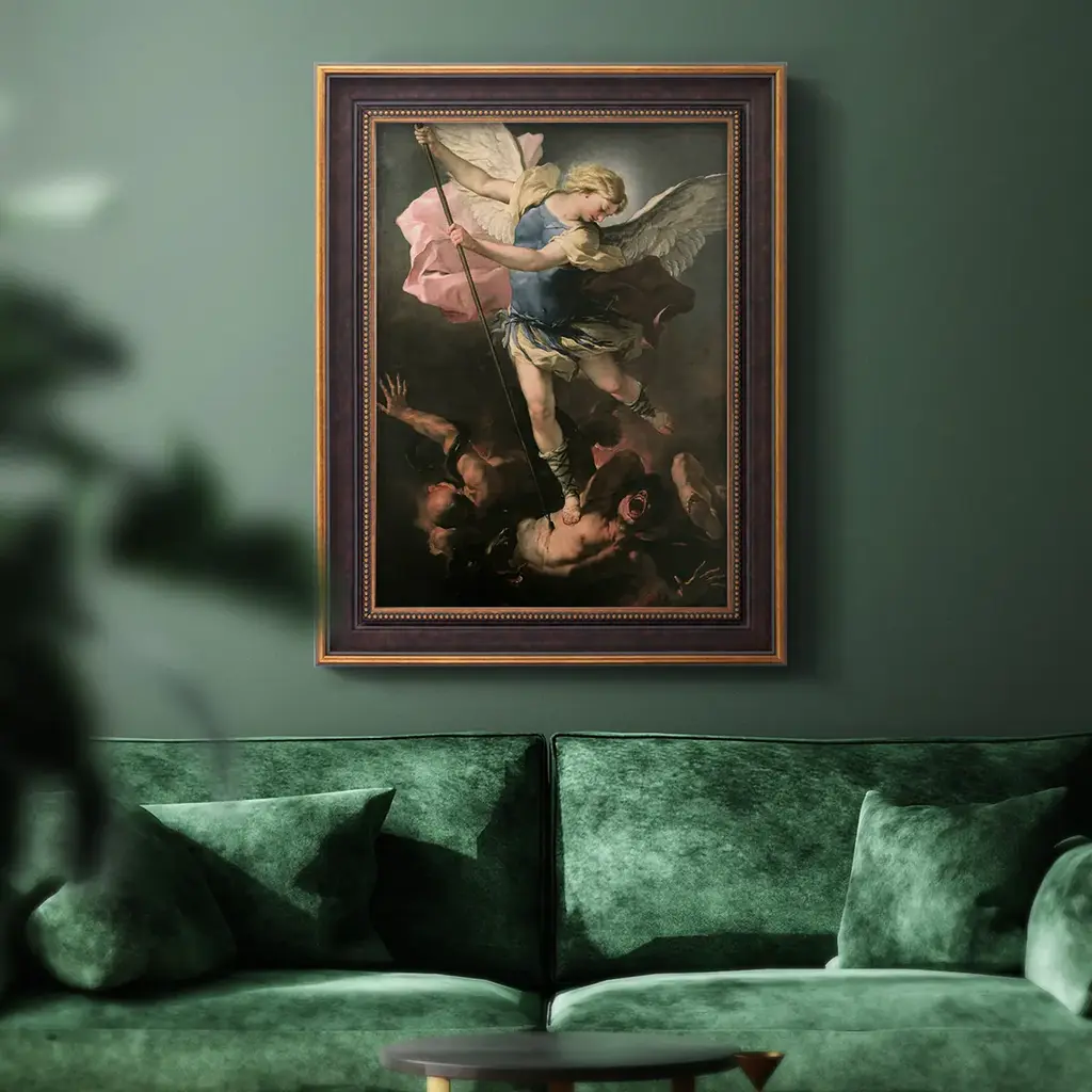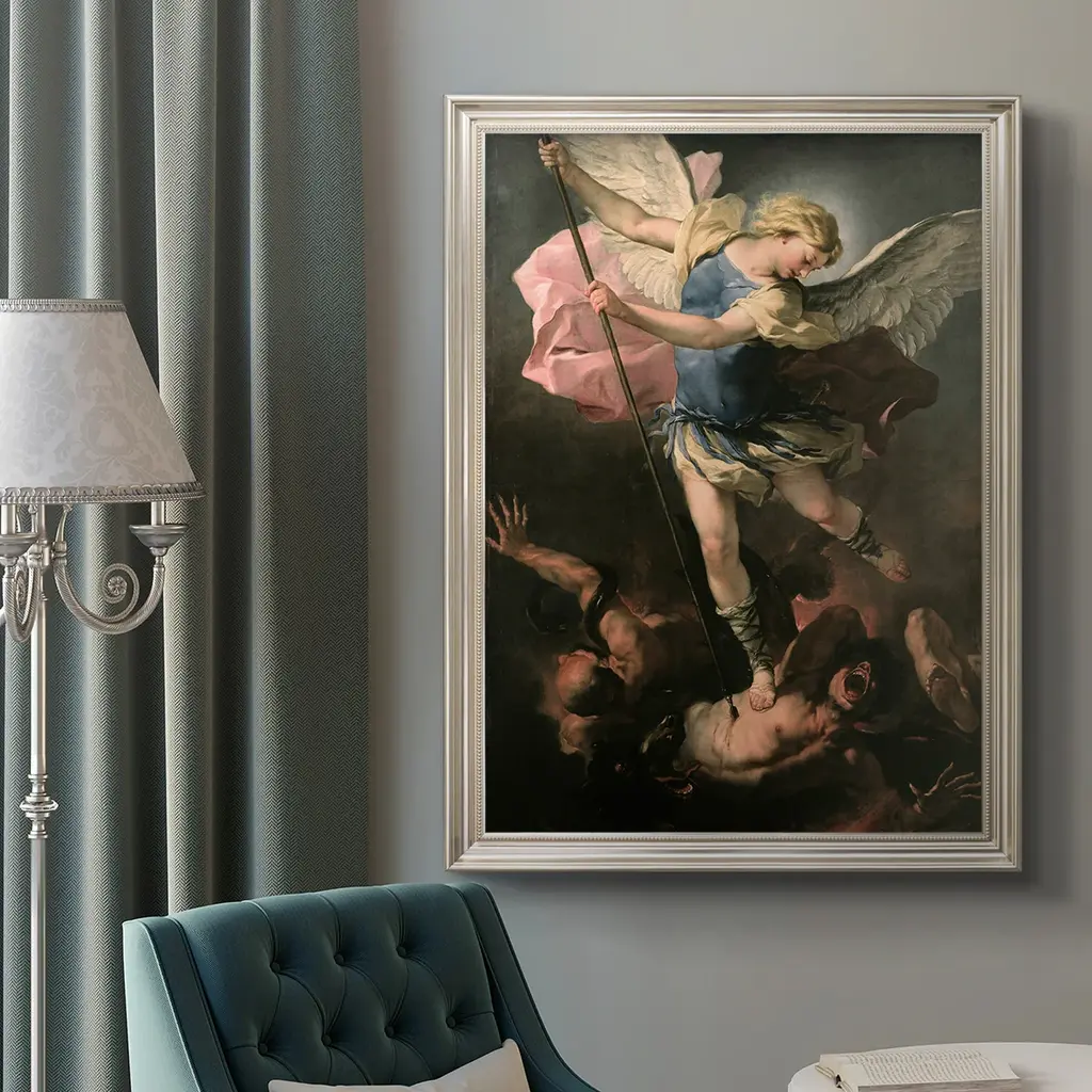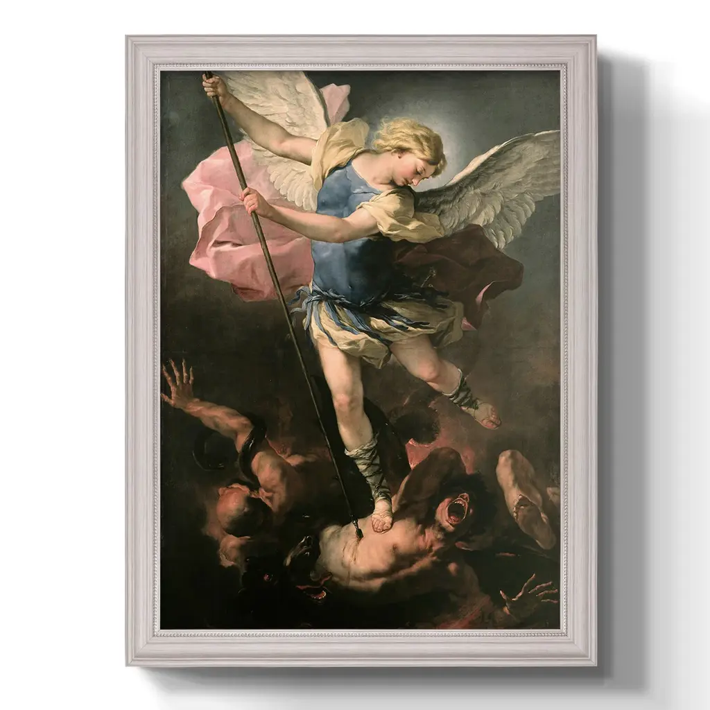 St. Michael Premium Framed Canvas- Ready to Hang A Premium Framed Canvas created to last. Framed in distressed wood and available in an array of sizes and colors Featuring a beveled a solid wood stretcher bar, each piece comes ready to hand 3 SIZES AVAILABLE 16''X20'' - Overall Size 18'X27'' - Overall Size 24''x36'' - Overall Size Each piece is made to order. Each piece comes with hanging hardware. Made in the USA Ready to Hang Giclee Paper Print Acrylic Glass Beveled Matt Board
