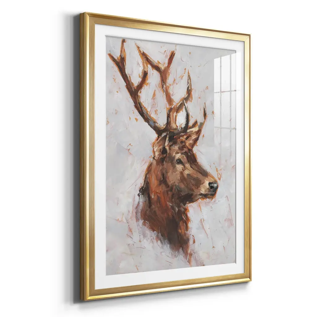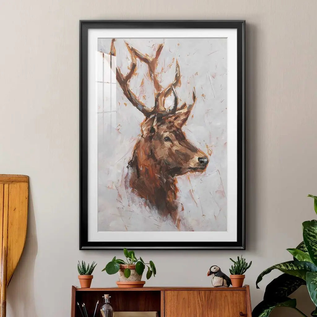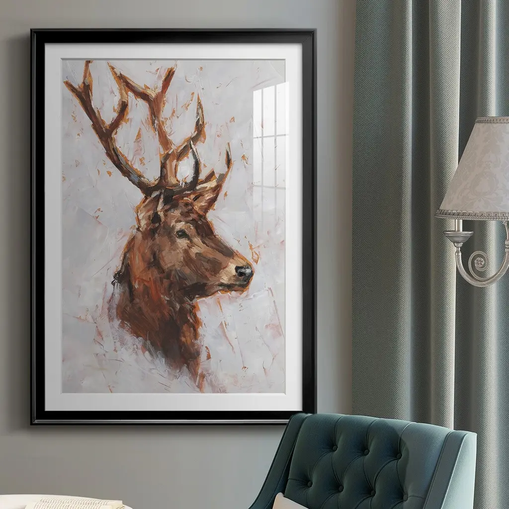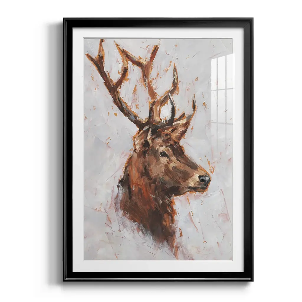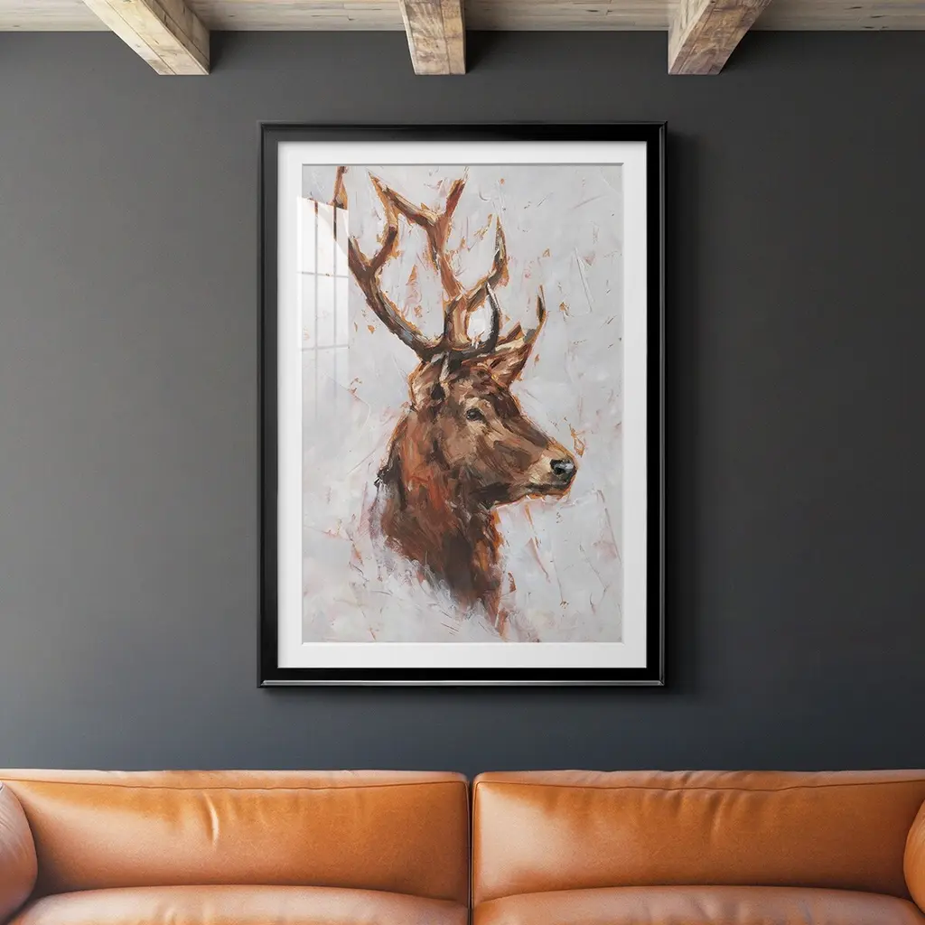 Stag Study II Premium Framed Print - Ready to Hang A Premium Framed Print created to last. Framed in distressed wood and available in an array of sizes and colors Featuring a beveled a solid wood stretcher bar, each piece comes ready to hand 4 SIZES AVAILABLE 30.5''X42.5'' - Overall Size 26.5'X36.5'' - Overall Size 22.5''x30.5'' - Overall Size 18.5''x24.5'' - Overall Size Each piece is made to order. Each piece comes with hanging hardware. Made in the USA Ready to Hang Giclee Paper Print Acrylic Glass Beveled Matt Board
