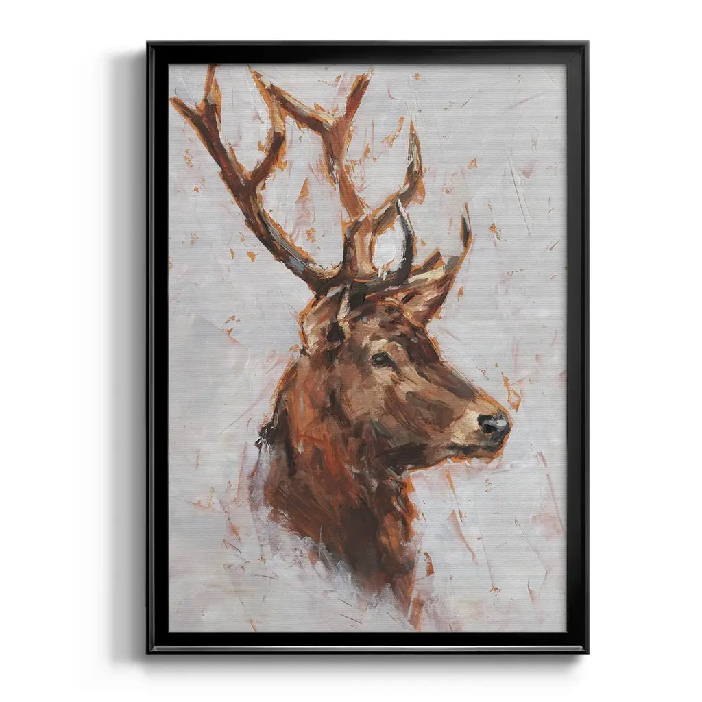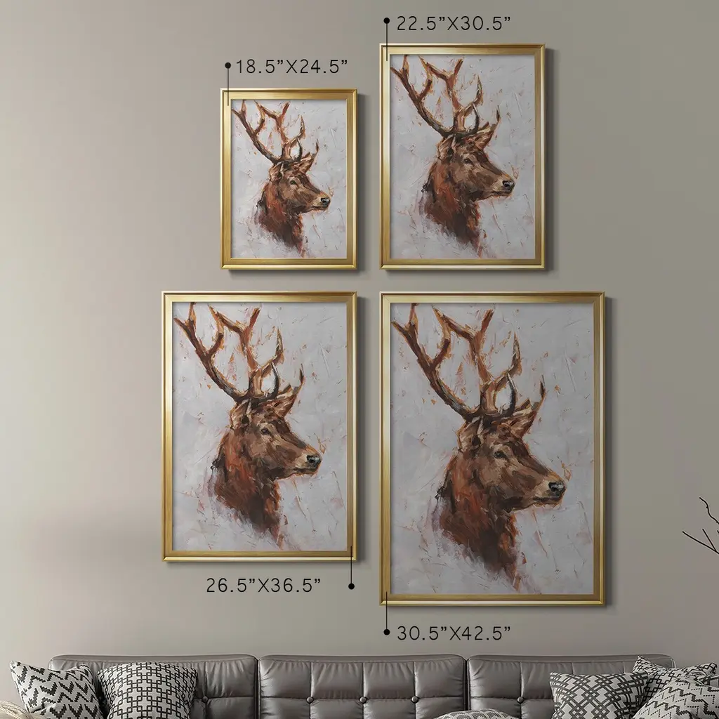 Stag Study II Premium Framed Print - Ready to Hang A Premium Framed Print created to last. Framed in distressed wood and available in an array of sizes and colors Featuring a beveled a solid wood stretcher bar, each piece comes ready to hand 4 SIZES AVAILABLE 30.5''X42.5'' - Overall Size 26.5'X36.5'' - Overall Size 22.5''x30.5'' - Overall Size 18.5''x24.5'' - Overall Size Each piece is made to order. Each piece comes with hanging hardware. Made in the USA Ready to Hang