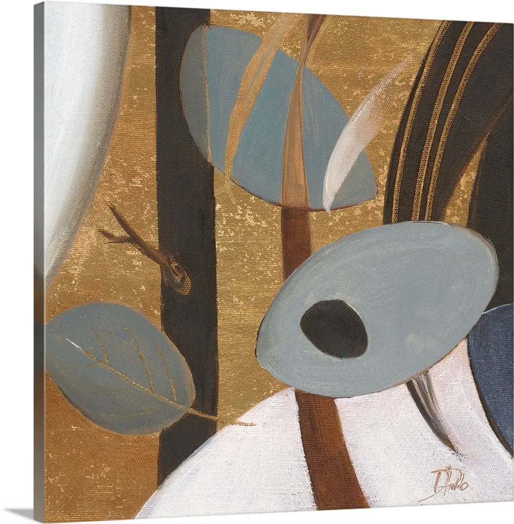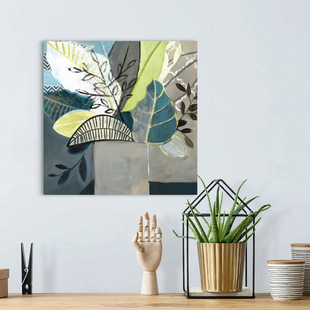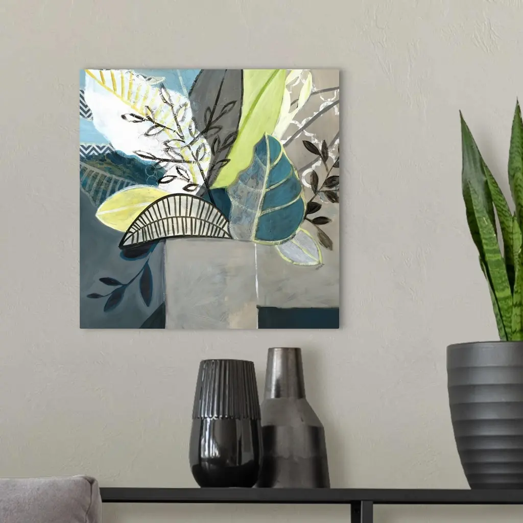 Contemporary abstract painting of a vase full of various leaves and greenery, on a decorative background of neutral and cool tones.