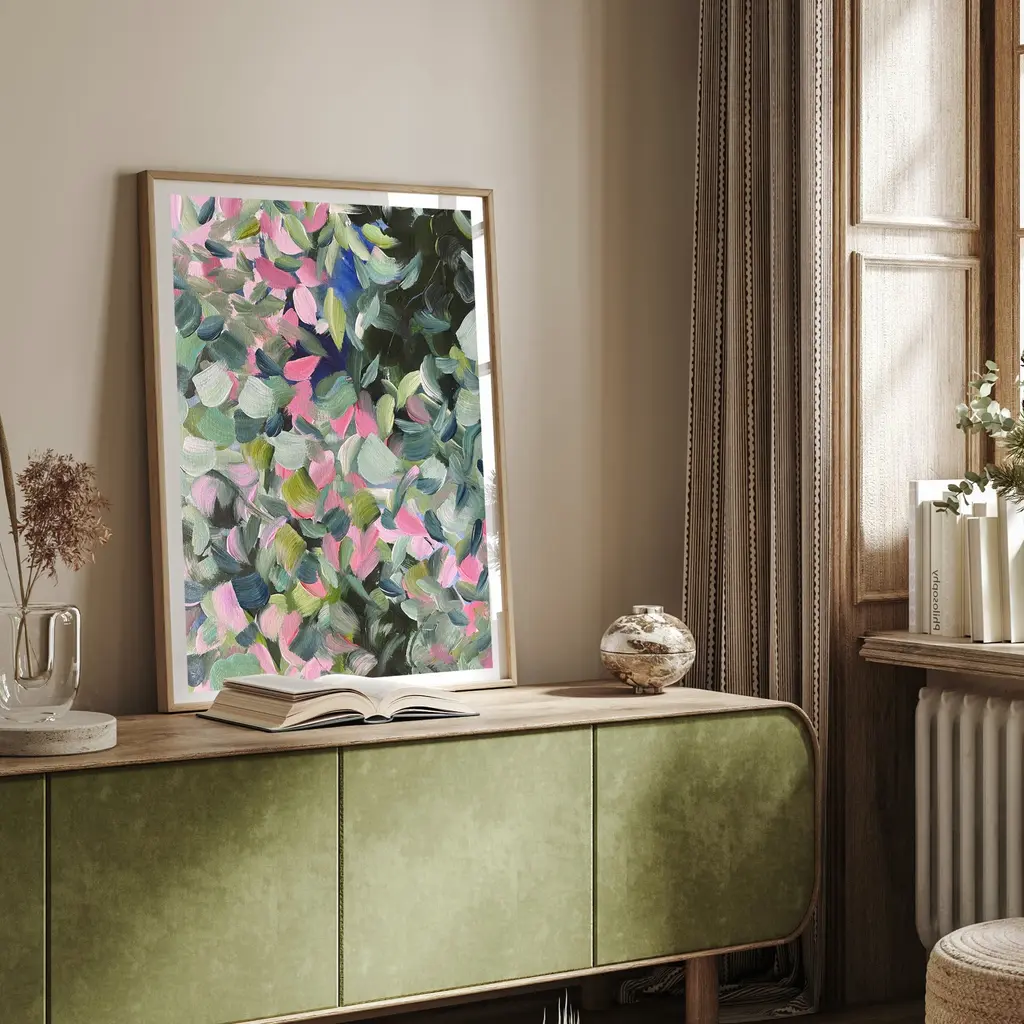 This calming and joyful abstract floral print captures the gentle movement of emerging spring flowers with expressive brushstrokes and a muted colour palette. Tonal sages and evergreens combined with muted pinks, deep forest greens and splashes of cobalt blue provide a beautiful addition to interiors where a calm and mindful atmosphere is sought.Printed on heavyweight 316gsm cotton rag textured paper using archival-quality inks, this A2 giclée print will maintain its beautiful vibrancy for many years to come. Each print has a white border so it can easily fit into a standard size frame. Print is sold unframed.