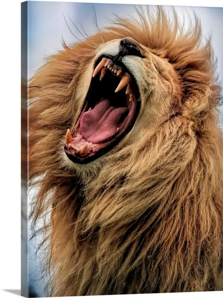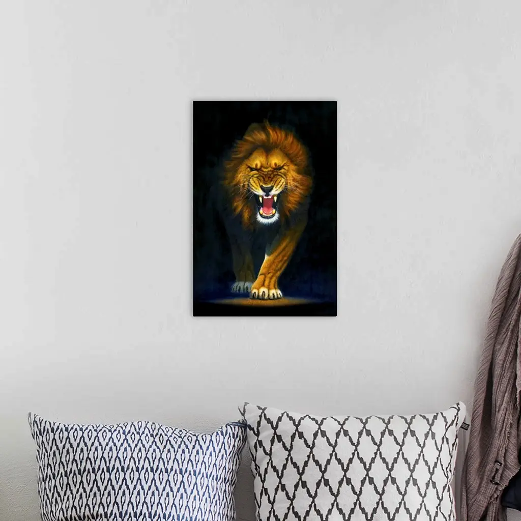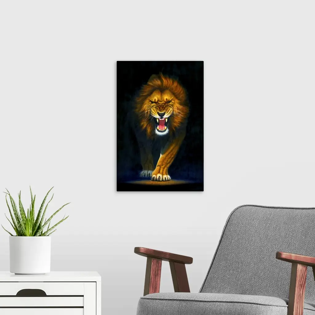 A large vertical painting of a lion as it walks forward and snarls showing its teeth.
