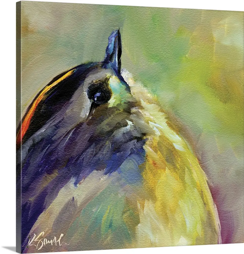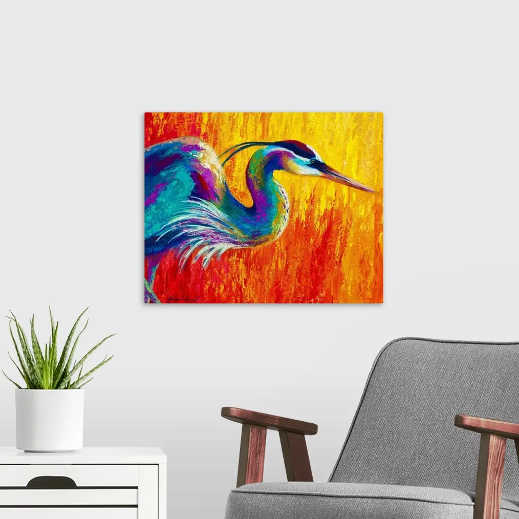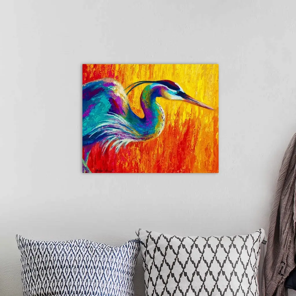 Contemporary art painting of a bright colored egret bird on a firey background.
