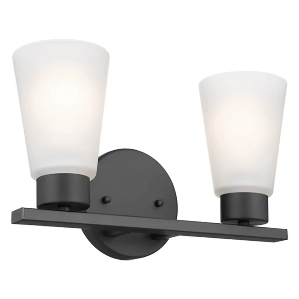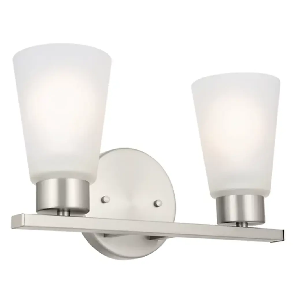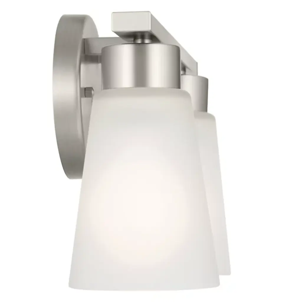 The Stamos Vanity Light from Kichler brings minimalist design to bathroom lighting through pure geometric forms. Its linear steel bar, extending from a circular backplate, supports two precisely angled shades, each crafted from satin-etched glass. Light filters evenly through the glass, creating optimal illumination for daily tasks without harsh shadows. The pared-down design removes unnecessary ornamentation while maintaining essential functionality. The fixture’s unfussy approach allows it to complement various bathroom styles without competing with other design elements.