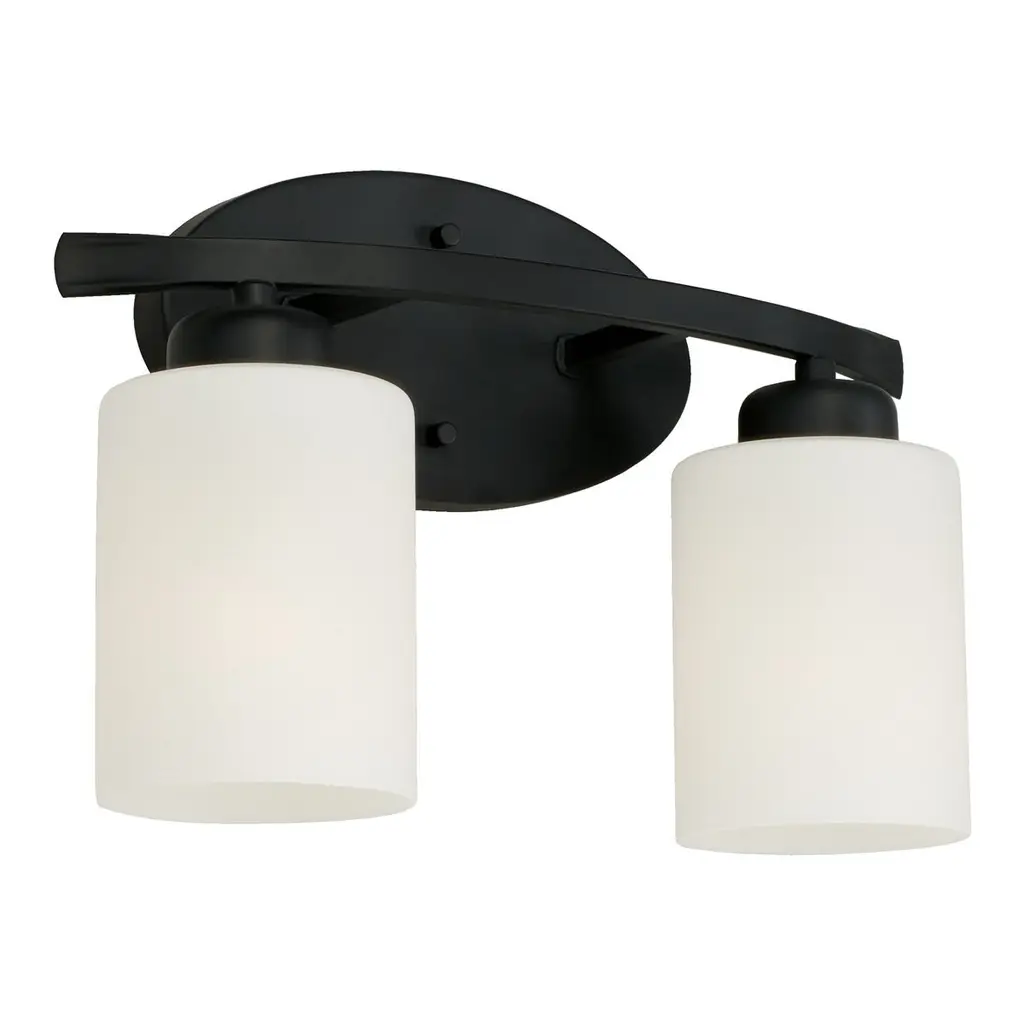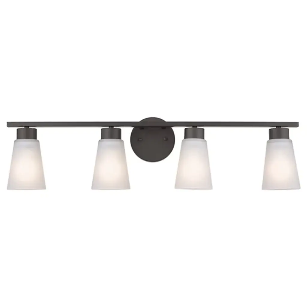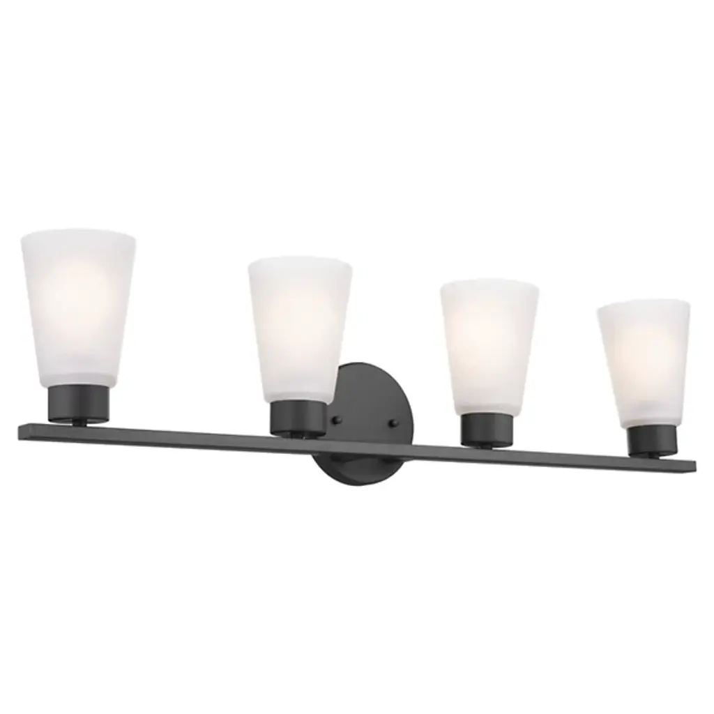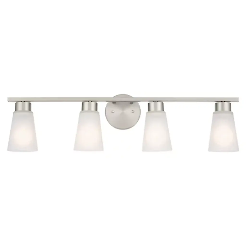 The Stamos Vanity Light from Kichler brings minimalist design to bathroom lighting through pure geometric forms. Its linear steel bar, extending from a circular backplate, supports two precisely angled shades, each crafted from satin-etched glass. Light filters evenly through the glass, creating optimal illumination for daily tasks without harsh shadows. The pared-down design removes unnecessary ornamentation while maintaining essential functionality. The fixture’s unfussy approach allows it to complement various bathroom styles without competing with other design elements.