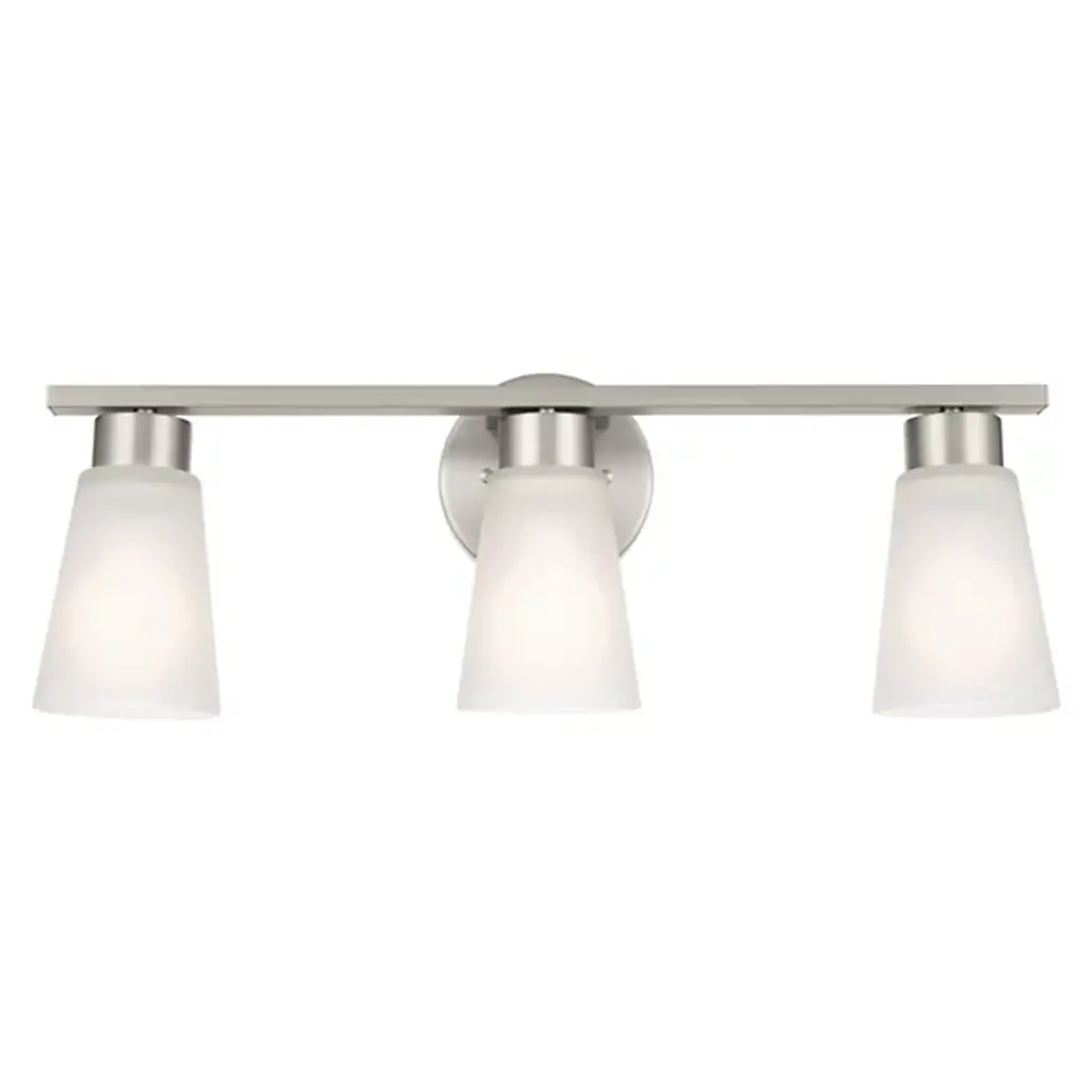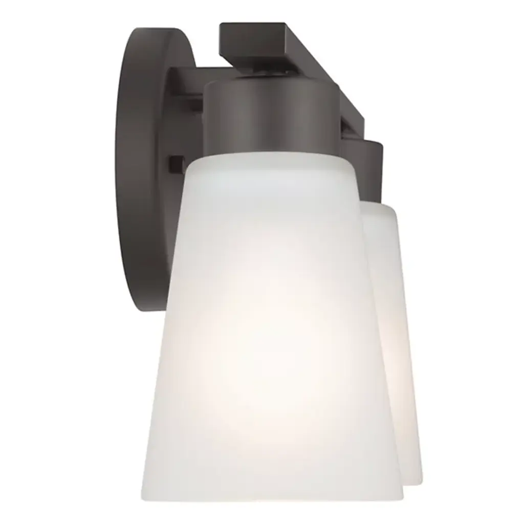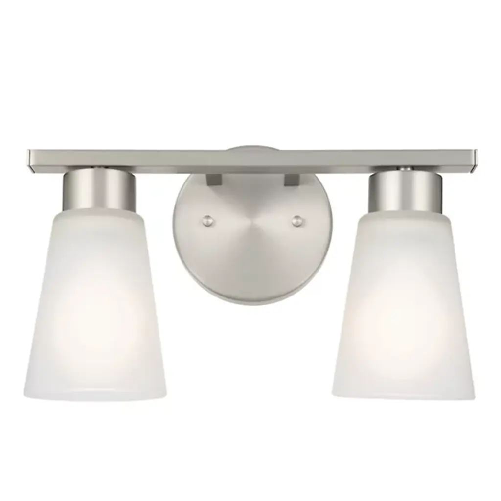 The Stamos Vanity Light from Kichler brings minimalist design to bathroom lighting through pure geometric forms. Its linear steel bar, extending from a circular backplate, supports two precisely angled shades, each crafted from satin-etched glass. Light filters evenly through the glass, creating optimal illumination for daily tasks without harsh shadows. The pared-down design removes unnecessary ornamentation while maintaining essential functionality. The fixture’s unfussy approach allows it to complement various bathroom styles without competing with other design elements.