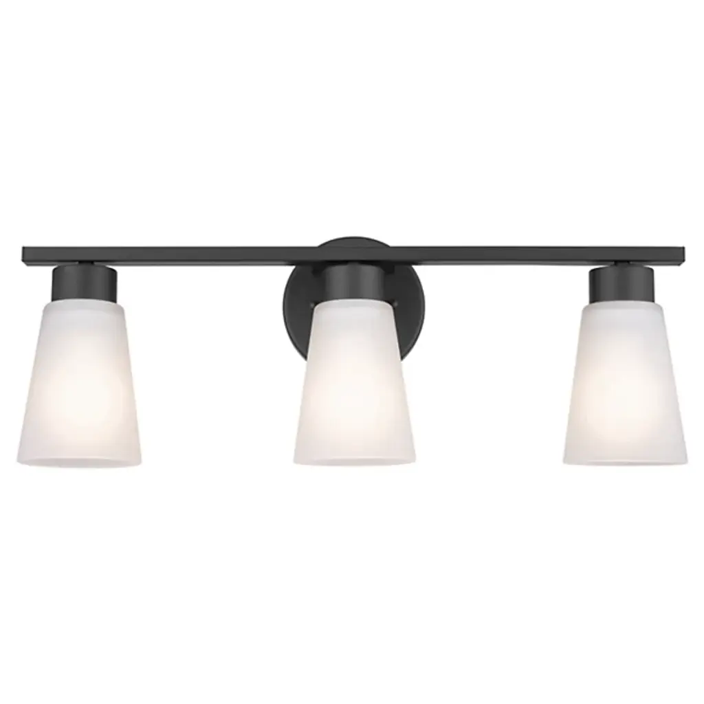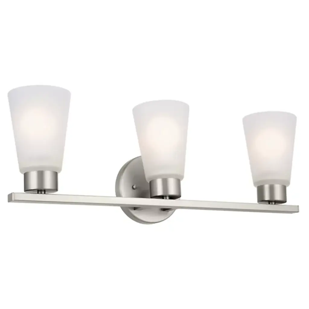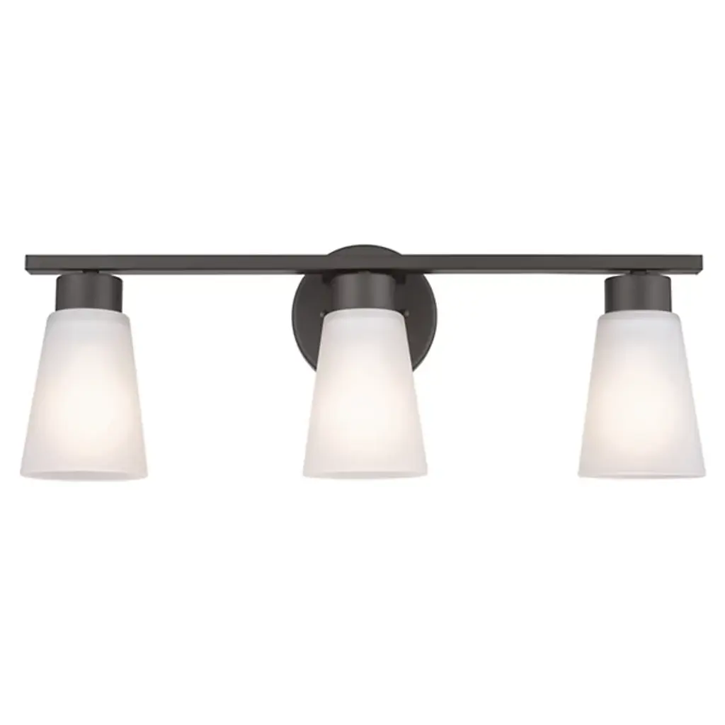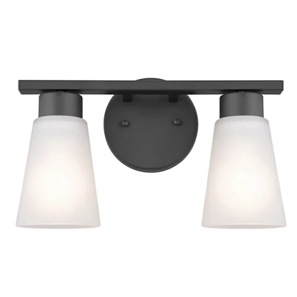 The Stamos Vanity Light from Kichler brings minimalist design to bathroom lighting through pure geometric forms. Its linear steel bar, extending from a circular backplate, supports two precisely angled shades, each crafted from satin-etched glass. Light filters evenly through the glass, creating optimal illumination for daily tasks without harsh shadows. The pared-down design removes unnecessary ornamentation while maintaining essential functionality. The fixture’s unfussy approach allows it to complement various bathroom styles without competing with other design elements.