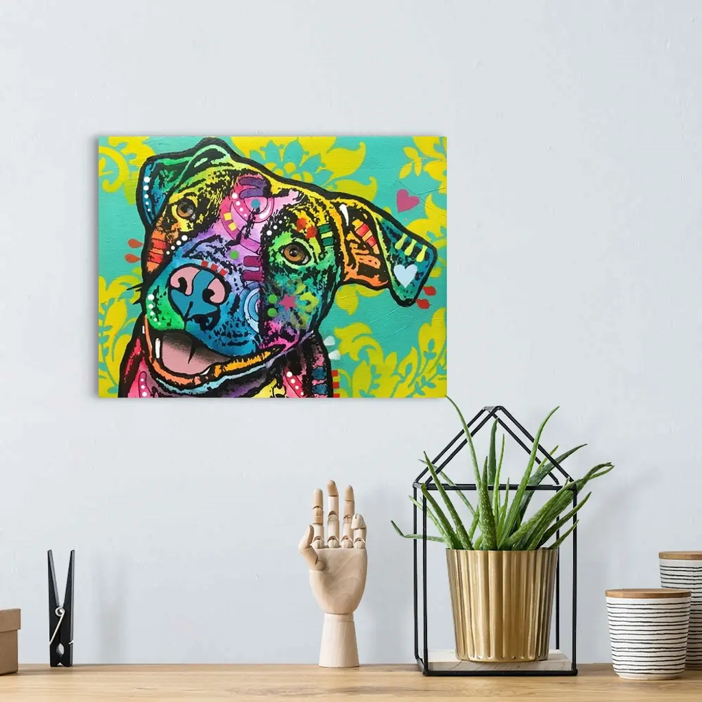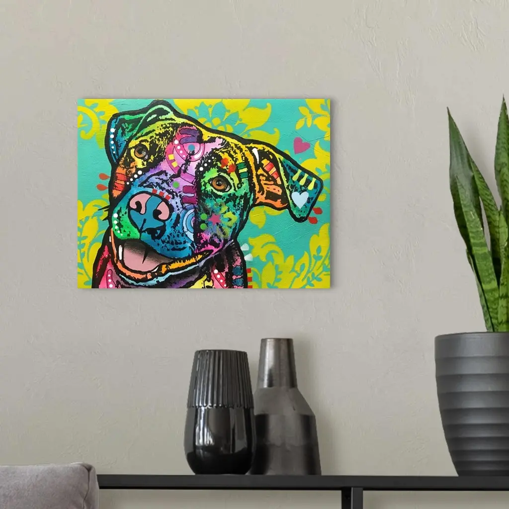 Contemporary stencil painting of a dog filled with various colors and patterns.