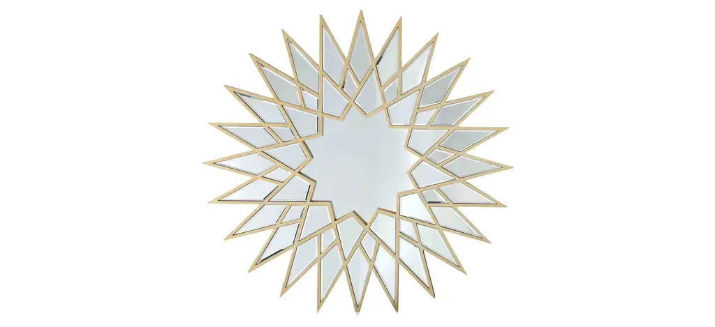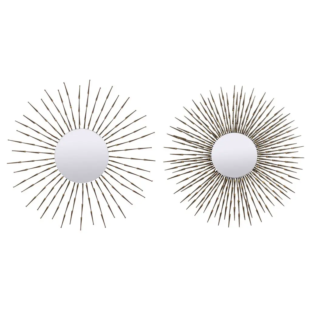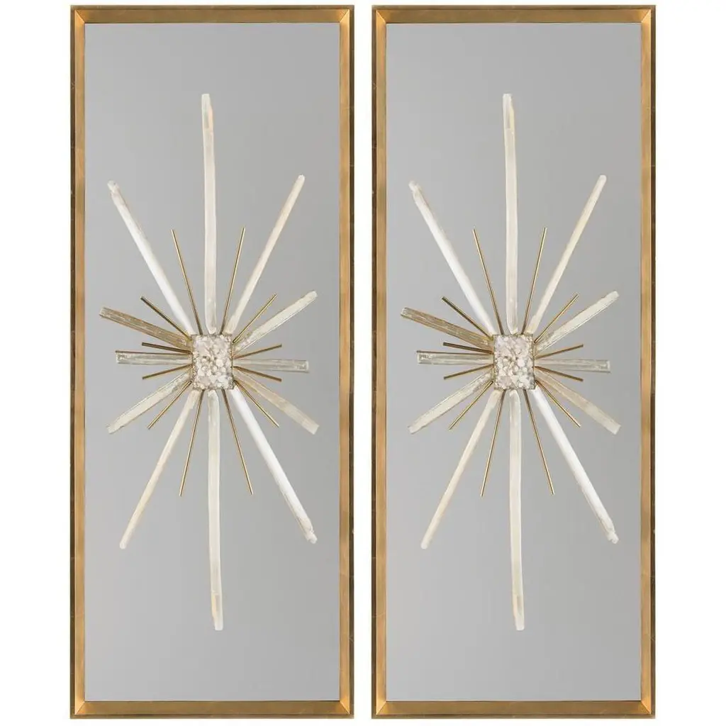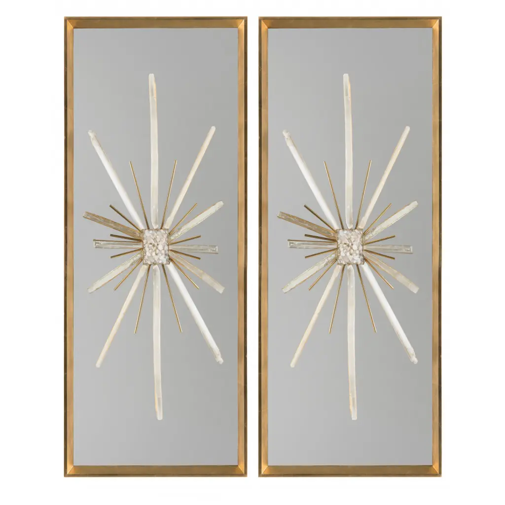 30"W X 30"H X 2"D (each) Elegant streams of selenite enhanced with gold leaf radiate from quartz and brass-enhanced embellishments. The mirrored backgrounds and gold frames add to the brilliance of these two star pieces.