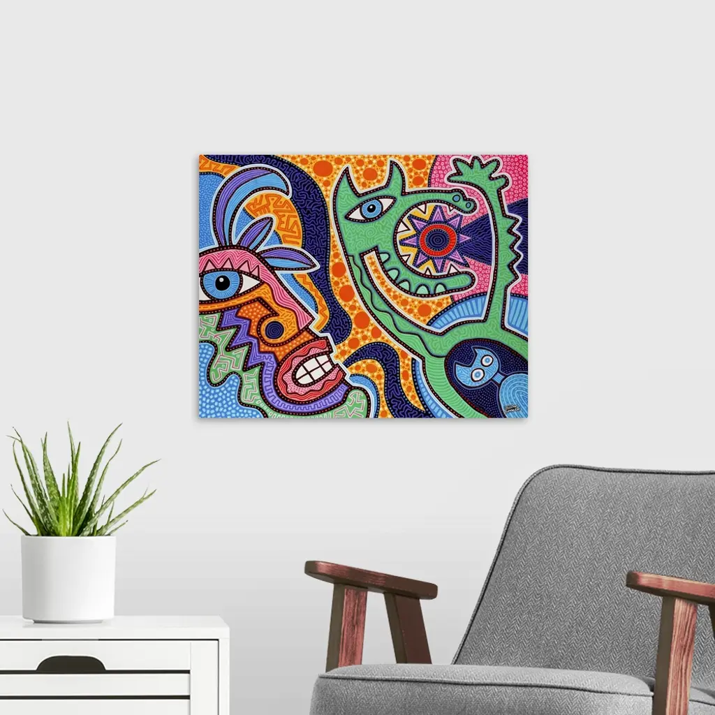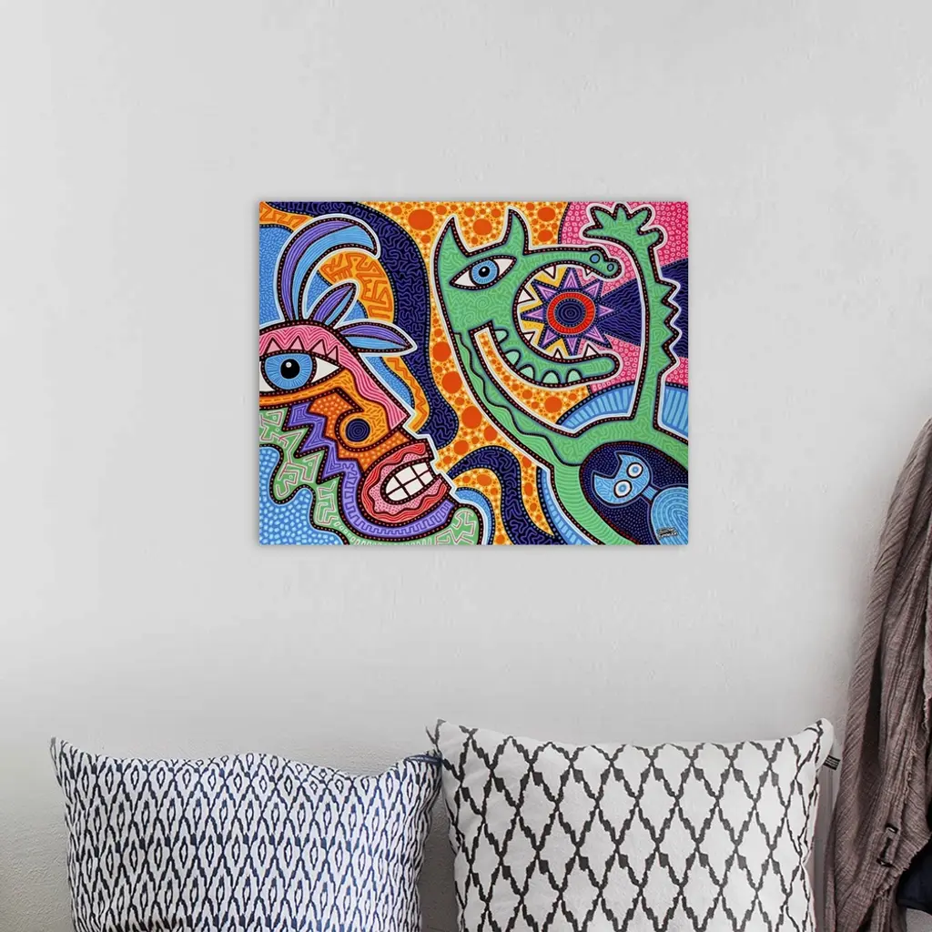 Contemporary aboriginal inspired artwork with bright colors and intricate detail.