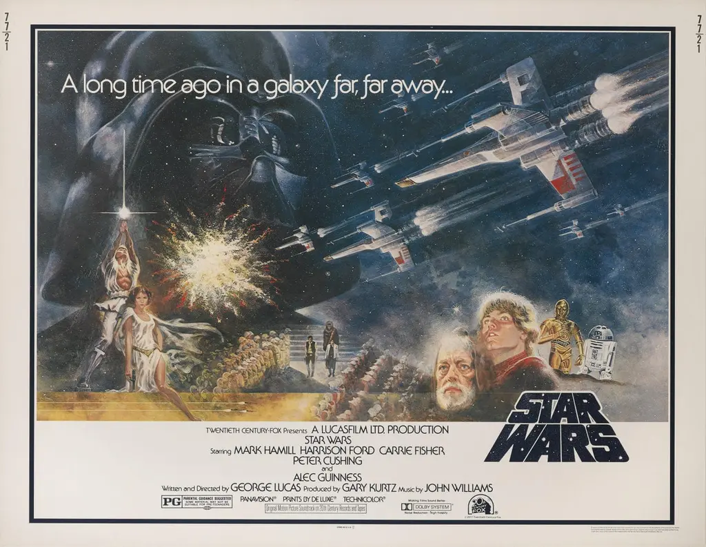 Original US film poster for Star Wars 1977.The film was directed by George Lucas and starred Mark Hamill, Harrison Ford and Carrie Fisher.The artwork on this poster is by Tom Jung (b.1942)This poster is in near mint condition unfolded and conservation paper backed and would be shipped in a very strong flat pack and sent by Fed-Ex