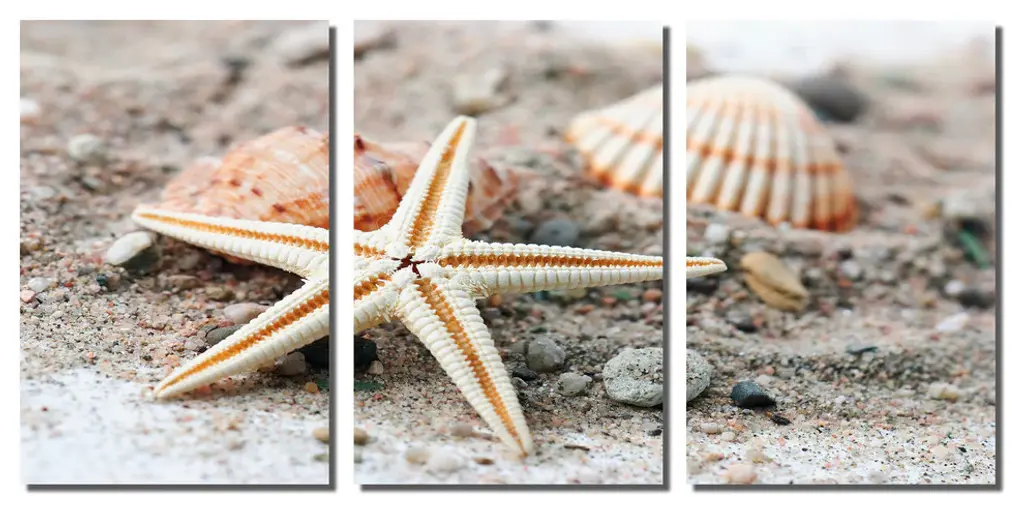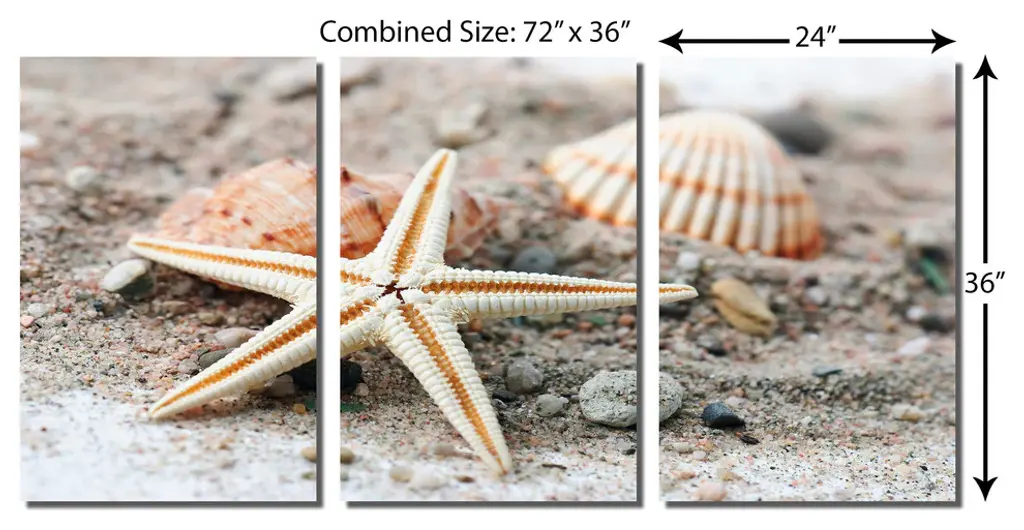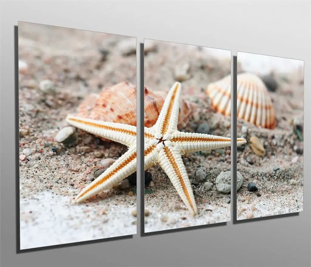 72"œ x 36"œ total size. Ready To Hang! (3 pieces - 24"œ x 36"œ each). 3 Panel Split (Triptych) Metal Print of a starfish and a seashell on sand. Modern metal wall art for home or office wall decor & interior design. Printed on Luxurious, HD aluminum glossy metal panels. Multi panel art.. HD aluminum panels. Metal print wall art. Includes Shadow Wall Mount on the back.• Aluminum Metal Wall Art• Made in USA• Ready to hang - No assembly required• Shadow mount hardware on the back• 0.045"œ thick HD Aluminum Panels• Scratch resistant, glossy finish• Superb color clarity, luxurious prints• Epson printing process• For indoor or moisture rich environment use• Easy to clean. Gently wipe with microfiber cloth.