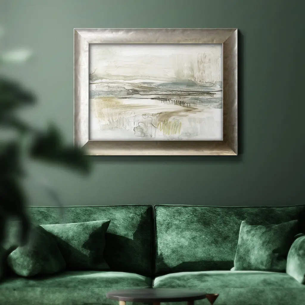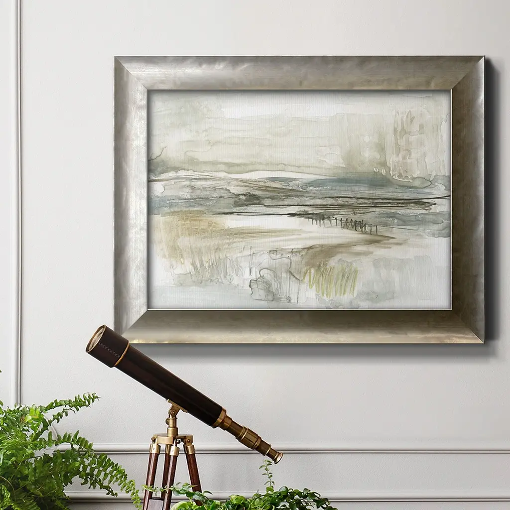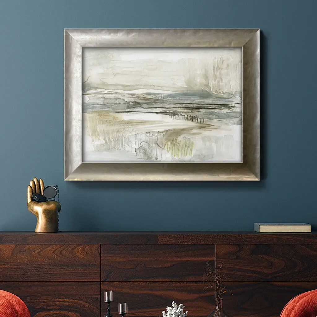 Stark Neutral Landscape II Premium Framed Canvas- Ready to Hang A Premium Framed Canvas created to last. Framed in distressed wood and available in an array of sizes and colors Featuring a beveled a solid wood stretcher bar, each piece comes ready to hand 3 SIZES AVAILABLE 16''X20'' - Overall Size 18'X27'' - Overall Size 24''x36'' - Overall Size Each piece is made to order. Each piece comes with hanging hardware. Made in the USA Ready to Hang Giclee Paper Print Acrylic Glass Beveled Matt Board
