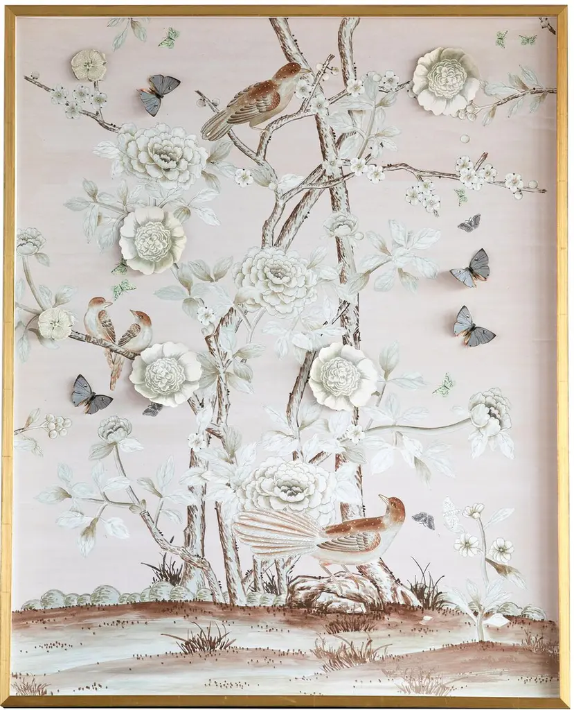 Hand-cut paper butterflies and flowers were attached atop this graceful giclée print, adding dimension to an already eye-catching image. The artwork arrives framed and ready to hang.