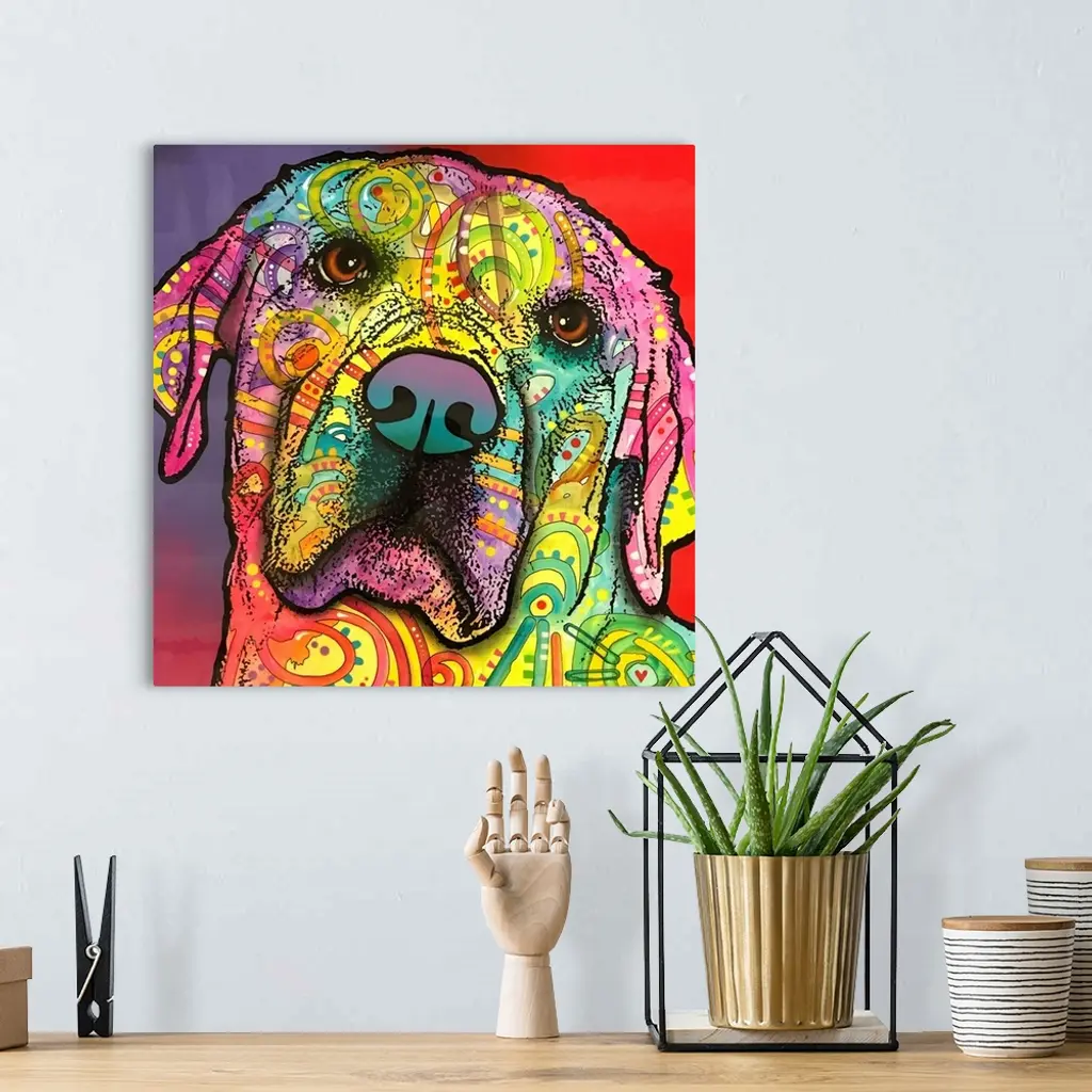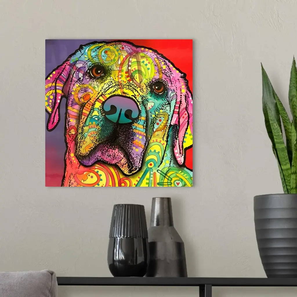 Square painting of a colorful Labrador face with graffiti-like designs on a red and purple background.