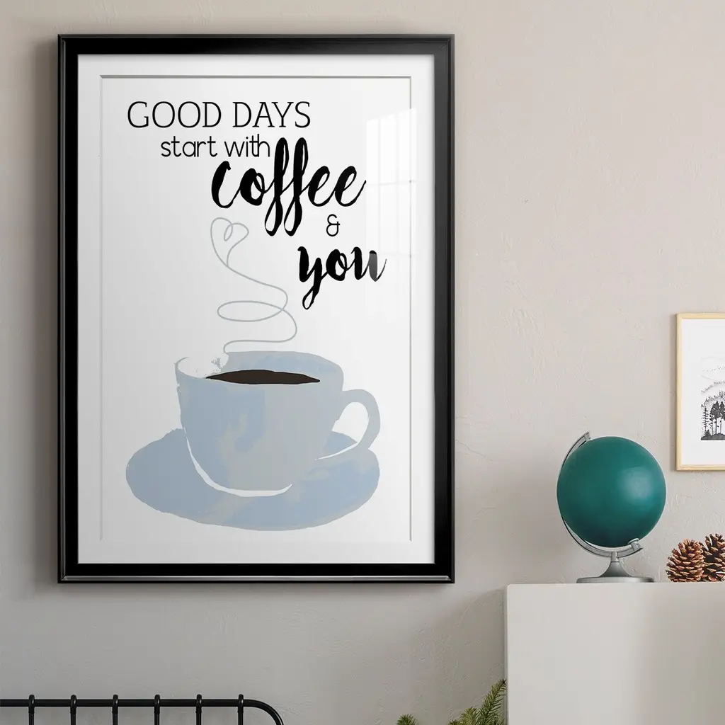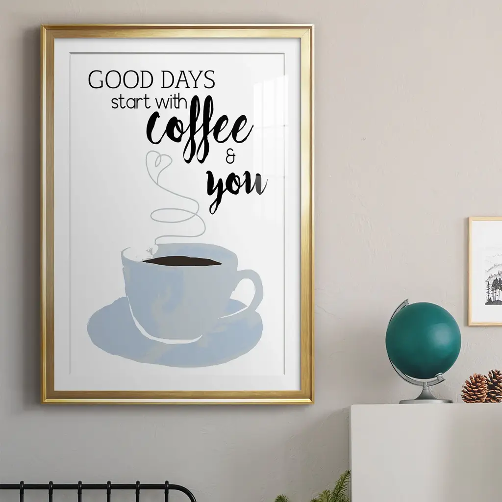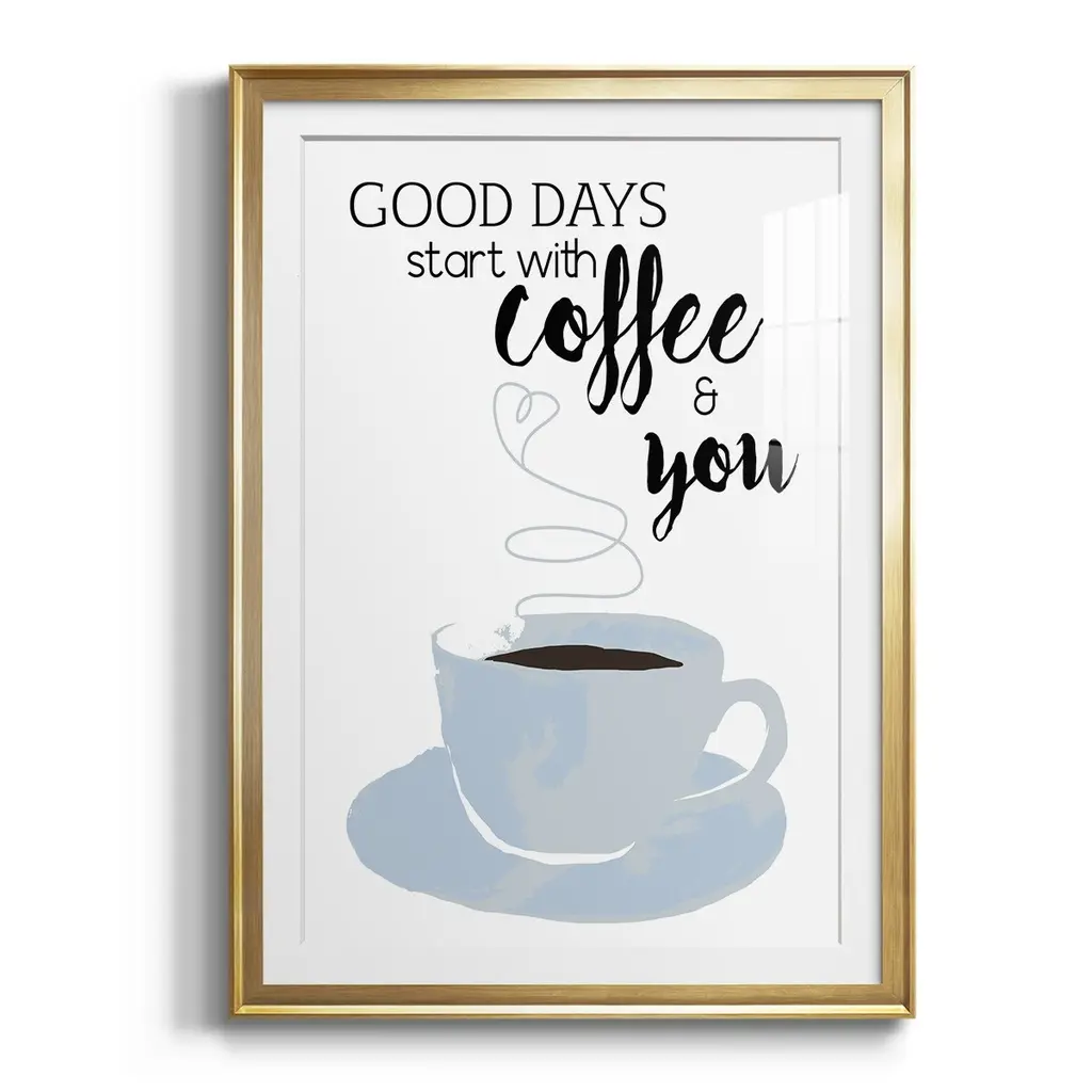Start With Coffee & You Premium Framed Print - Ready to Hang A Premium Framed Print created to last. Framed in distressed wood and available in an array of sizes and colors Featuring a beveled a solid wood stretcher bar, each piece comes ready to hand 4 SIZES AVAILABLE 30.5''X42.5'' - Overall Size 26.5'X36.5'' - Overall Size 22.5''x30.5'' - Overall Size 18.5''x24.5'' - Overall Size Each piece is made to order. Each piece comes with hanging hardware. Made in the USA Ready to Hang Giclee Paper Print Acrylic Glass Beveled Matt Board