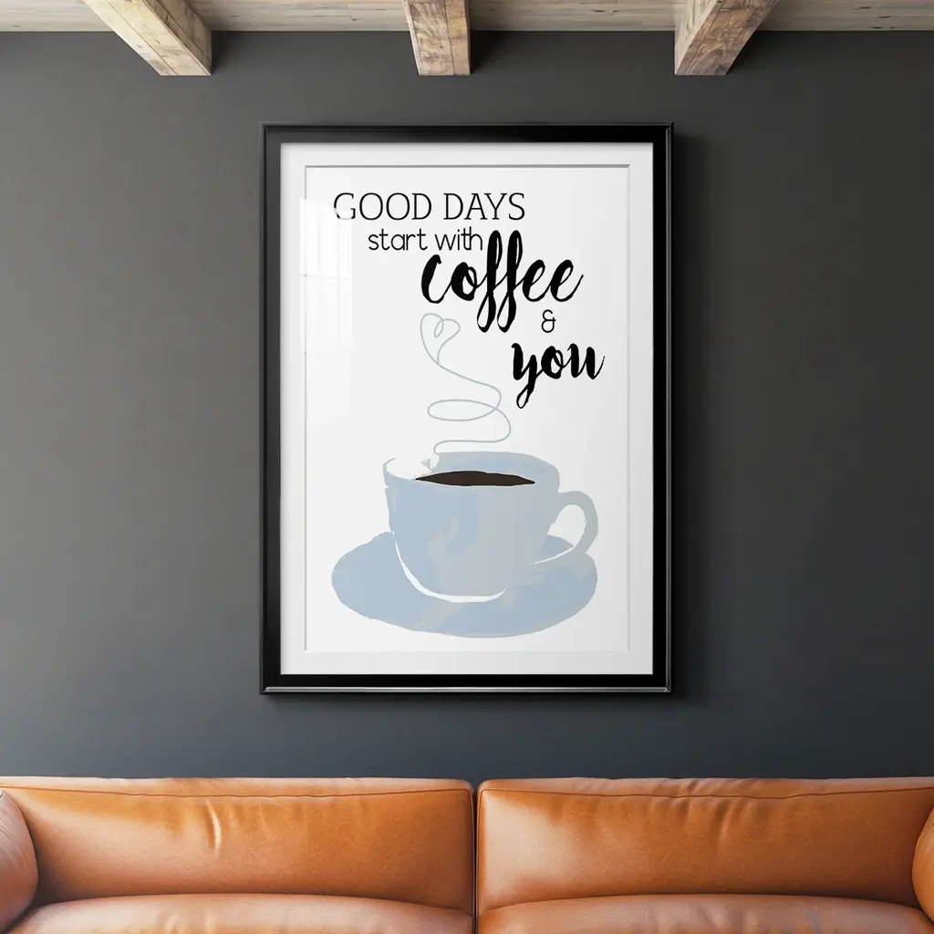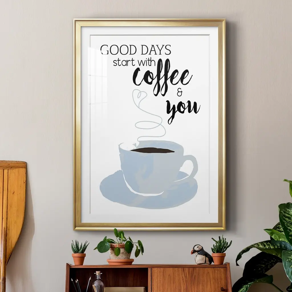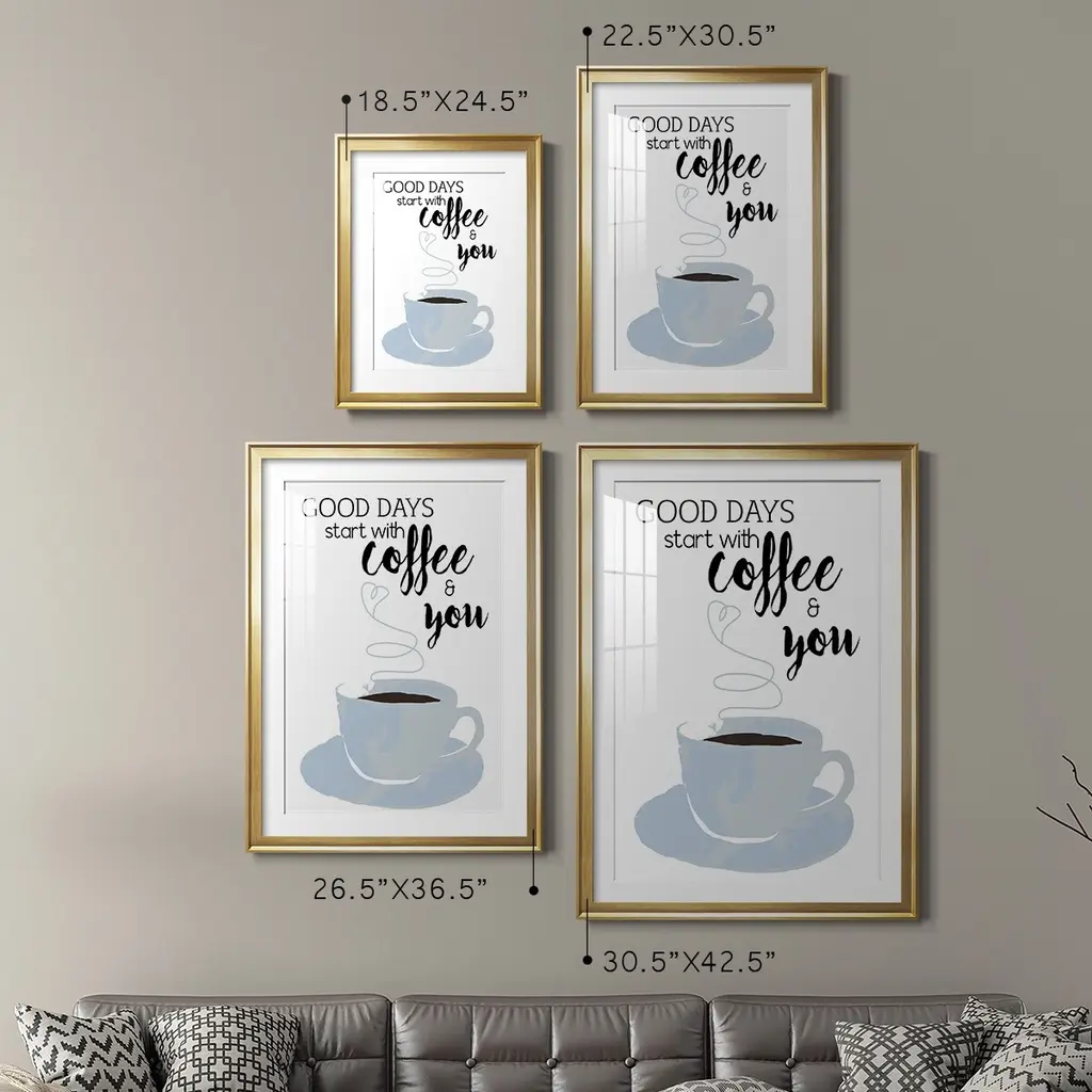 Start With Coffee & You Premium Framed Print - Ready to Hang A Premium Framed Print created to last. Framed in distressed wood and available in an array of sizes and colors Featuring a beveled a solid wood stretcher bar, each piece comes ready to hand 4 SIZES AVAILABLE 30.5''X42.5'' - Overall Size 26.5'X36.5'' - Overall Size 22.5''x30.5'' - Overall Size 18.5''x24.5'' - Overall Size Each piece is made to order. Each piece comes with hanging hardware. Made in the USA Ready to Hang Giclee Paper Print Acrylic Glass Beveled Matt Board