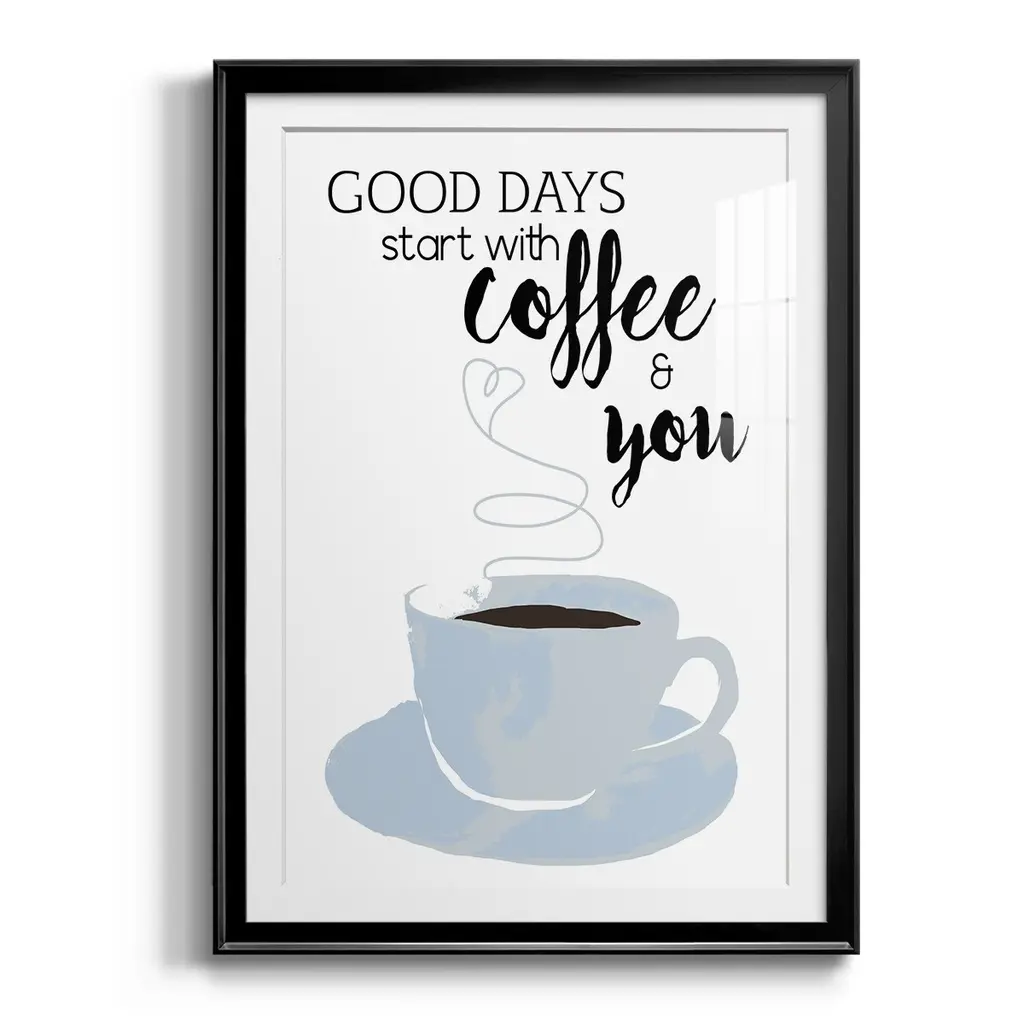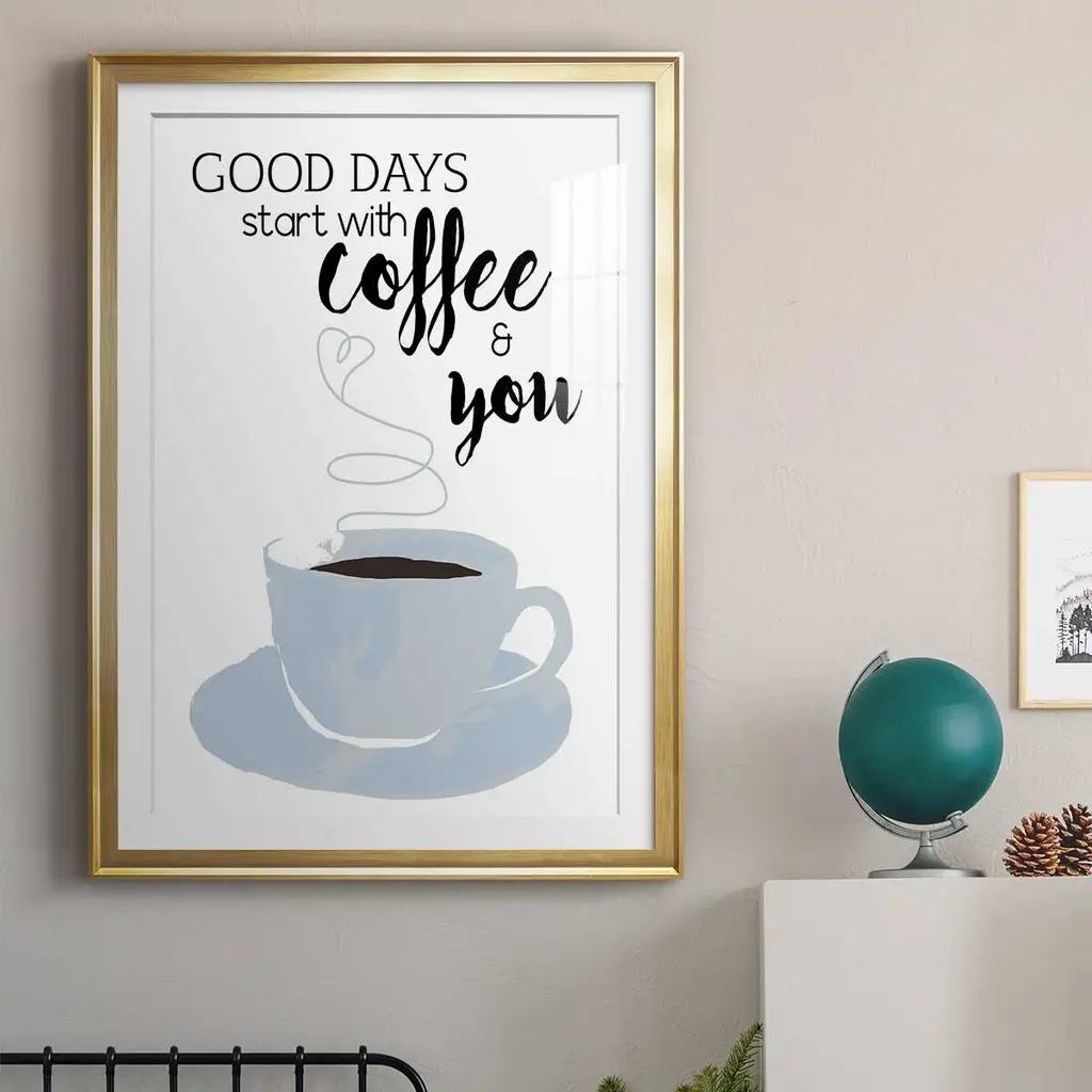 Start With Coffee & You Premium Framed Print - Ready to Hang A Premium Framed Print created to last. Framed in distressed wood and available in an array of sizes and colors Featuring a beveled a solid wood stretcher bar, each piece comes ready to hand 4 SIZES AVAILABLE 30.5''X42.5'' - Overall Size 26.5'X36.5'' - Overall Size 22.5''x30.5'' - Overall Size 18.5''x24.5'' - Overall Size Each piece is made to order. Each piece comes with hanging hardware. Made in the USA Ready to Hang Giclee Paper Print Acrylic Glass Beveled Matt Board