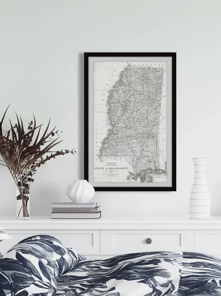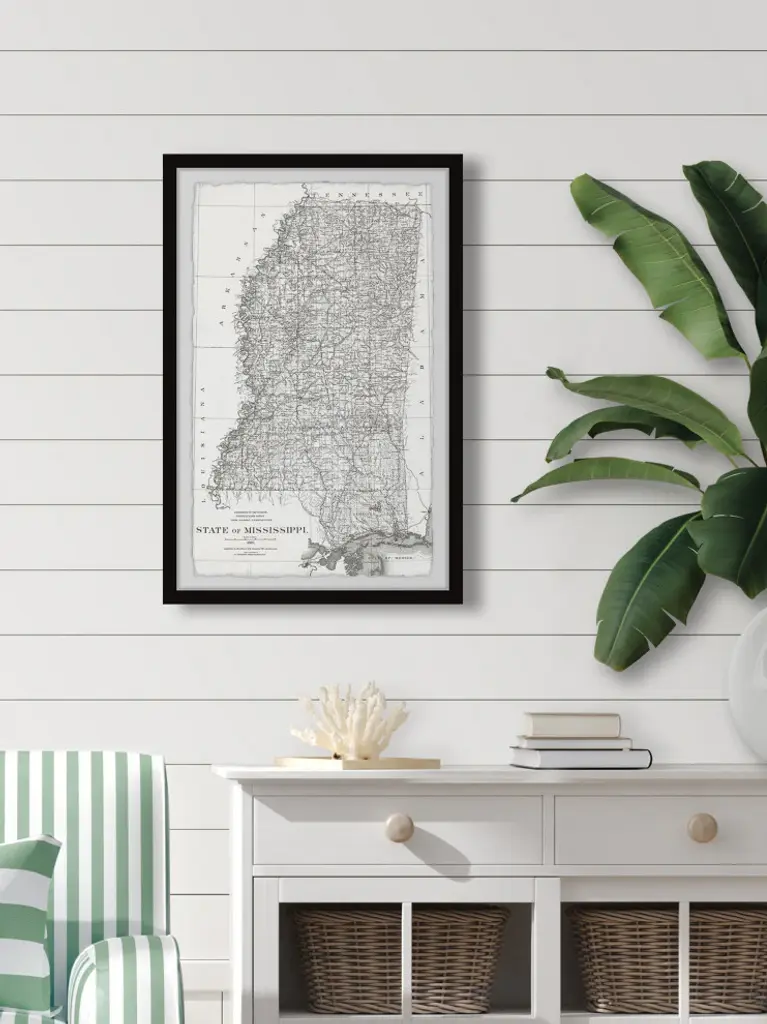 This map features the entire state of Mississippi and what each city has to offer. Proudly printed in the USA, this piece is printed on high quality archive paper and professionally hand-framed. With wall-mounting hooks included, this artful accent is ready to hang up as soon as it reaches your front door.- Top quality Gicle print on high resolution Archive Paper- Hand cut deckled edges- High quality durable non-warping frame- Finished under shatter resistant plexiglass- Arrives ready to hang- Includes a certificate of authenticity- Printed in the USA