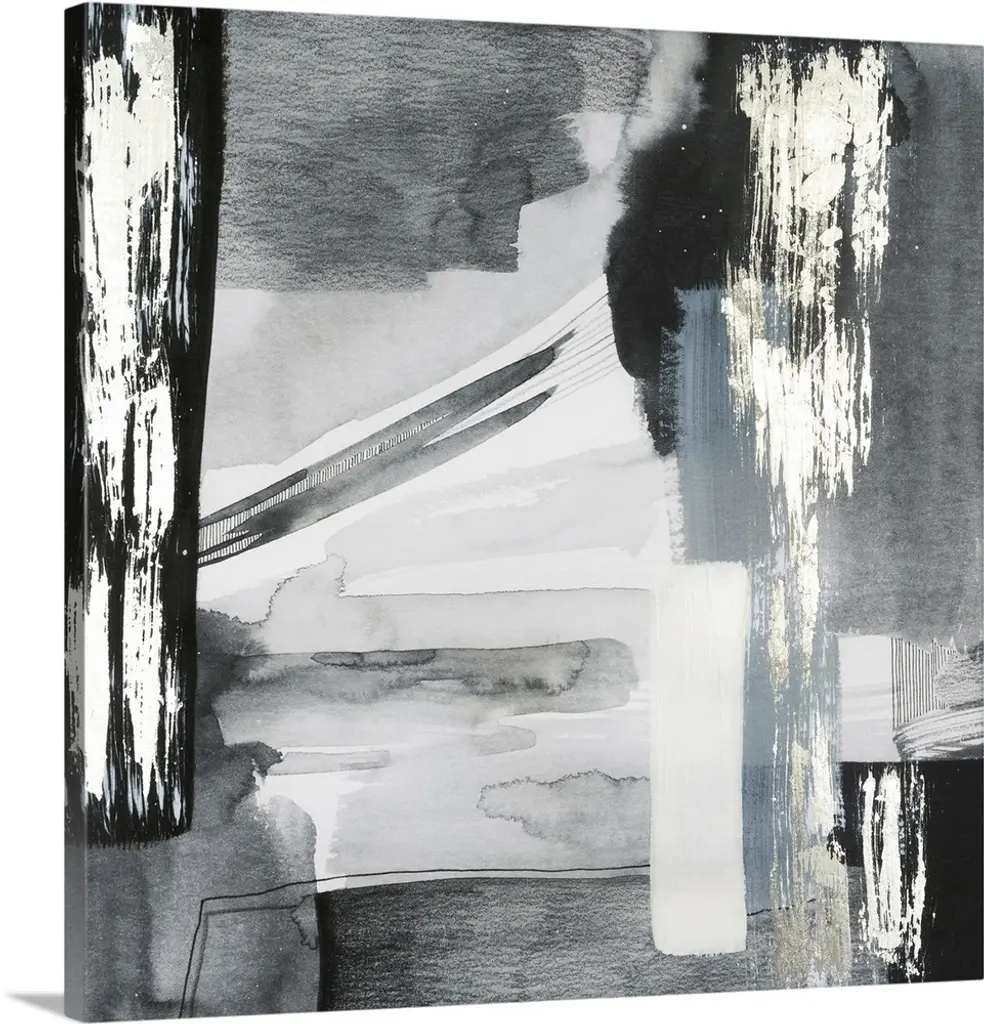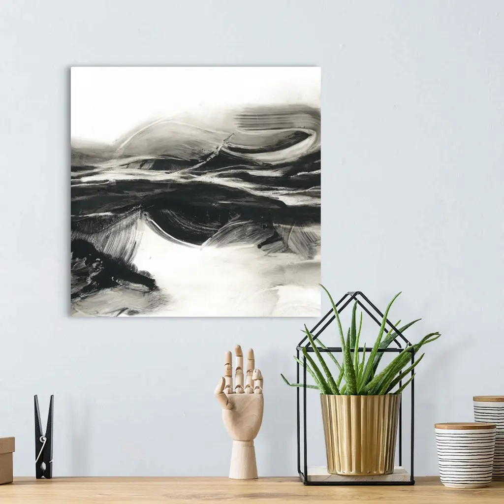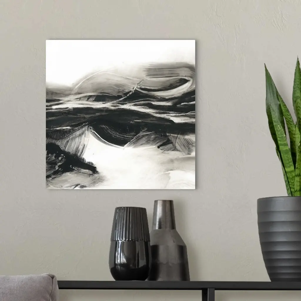 Sweeping horizontal black brush strokes fills this contemporary painting with stirring energy.