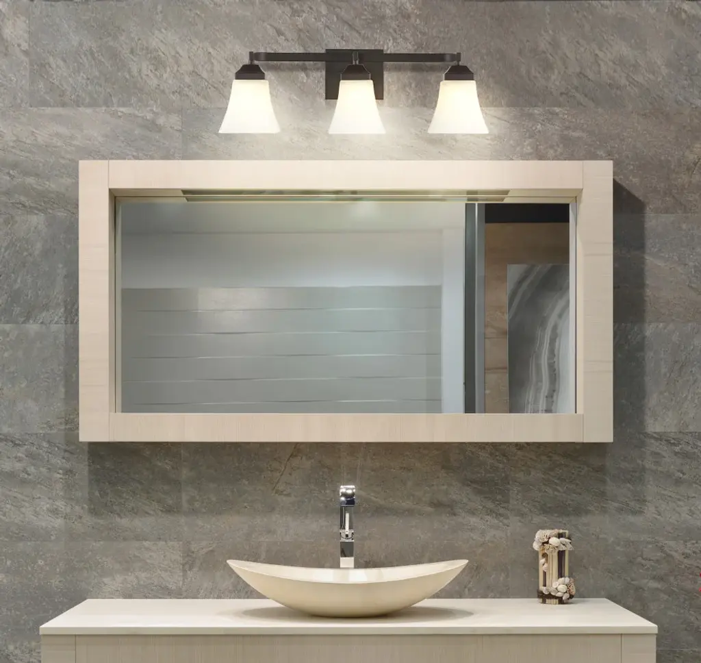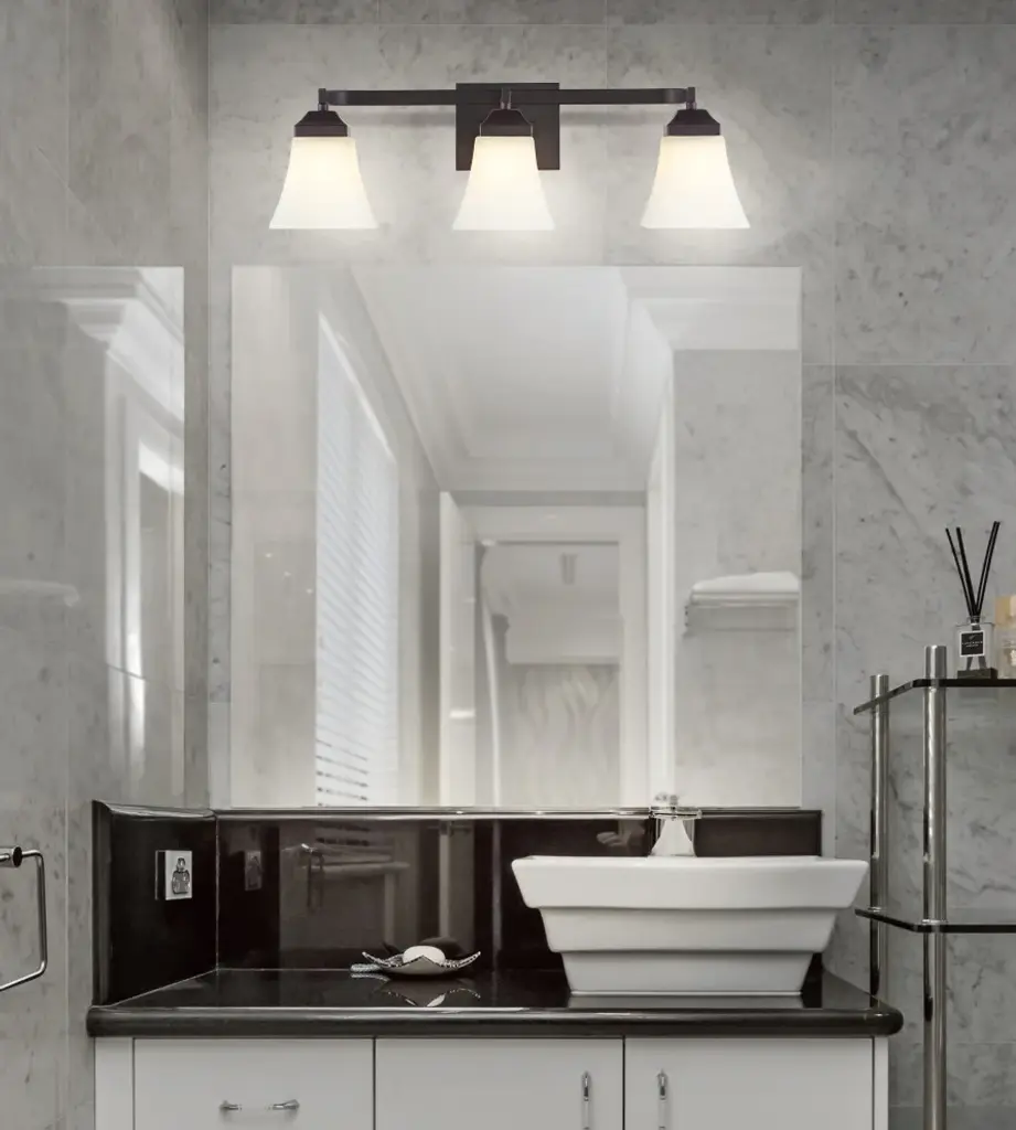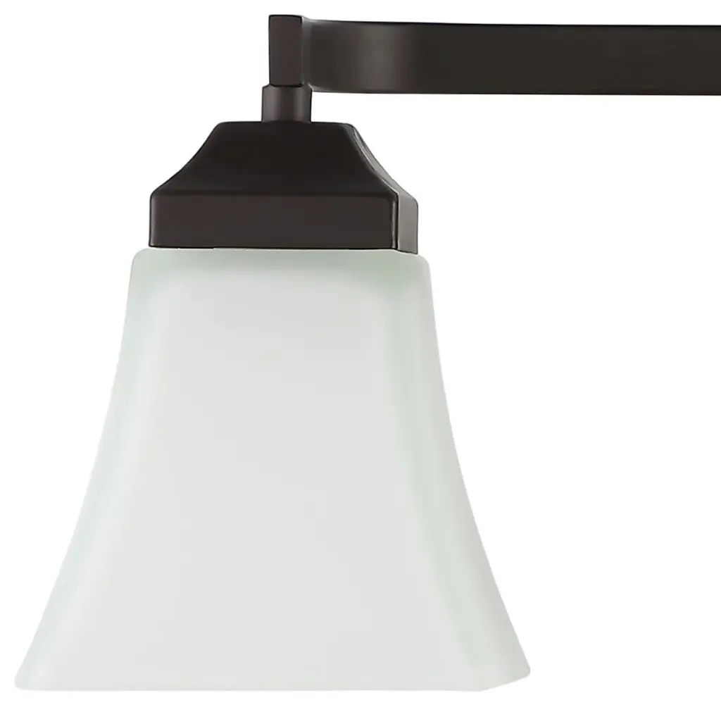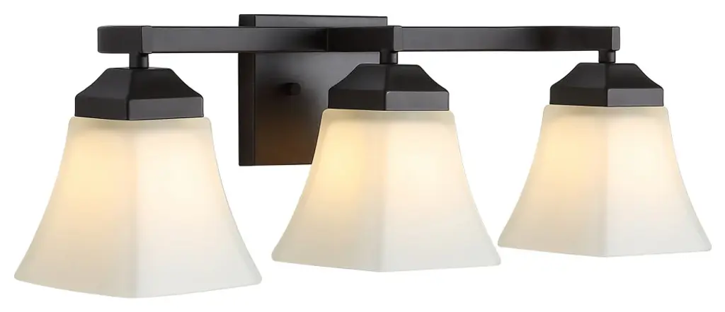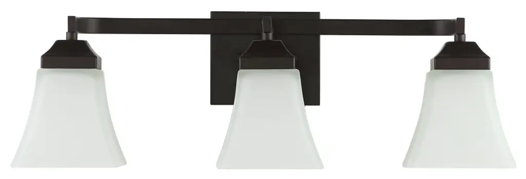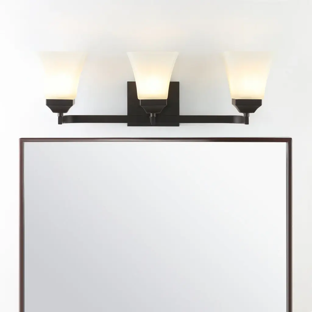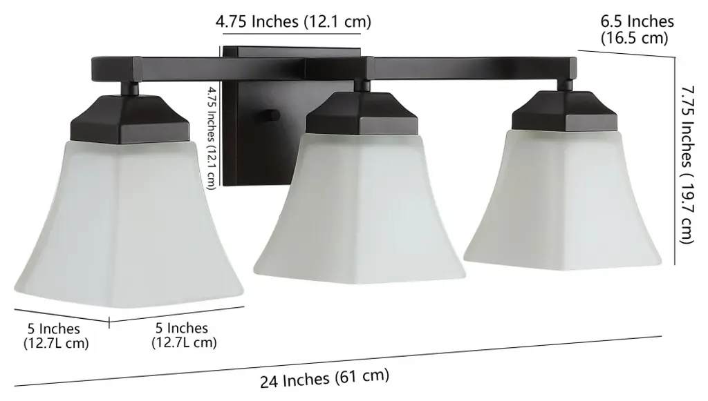 The squared lines of this 3-light vanity fixture give it a pared-down traditional look. A soft black finish and flared shades add low-key vintage style over a bathroom mirror. Frosted glass provides soft, diffused light from the bright LED bulbs.Features:• Give your bathroom vanity an instant makeover with our black finish and modern cottage aesthetic• This 3-light fixture is perfect for a single sink in a large bathroom; or use one over each sink on a double vanity• Takes 3 bulbs and compatible with any 9W LED or 40W TYPE "A"/"B" or 13W CFL• Eco-Friendly 4W LED bulb included• As this fixture must be hardwired, we recommend a professional electrician manage installation• Color: Oil Rubbed Bronze• Body Material: Iron/Glass• Includes: 1 lamps• Assembly RequiredDimensions:• Lamp: 7.75 inches high x 24 inches wide x 6.5 inches deepAbout us:You see a lamp.We see a decorative work of art.A perfectly curved shade casts a dramatic shadow on a floor. Compatible with LED lightbulbs: as easy on the environment as they are on the eyes. The JONATHAN Y Lighting collection considers every detail from impeccably sourced materials to designer styling. And our prices are so attractive, weââ"šÂ¬Ã¢"žÂ¢ve transformed a functional necessity into a fashion accessory.JONATHAN Y Lighting - a fashion revolution in home decor.