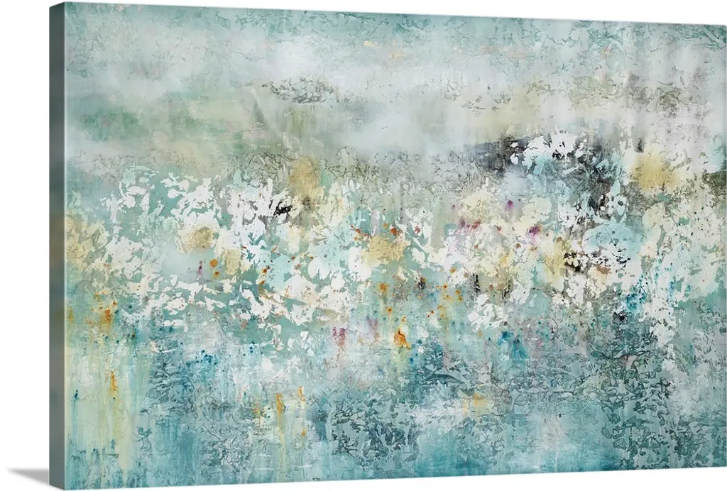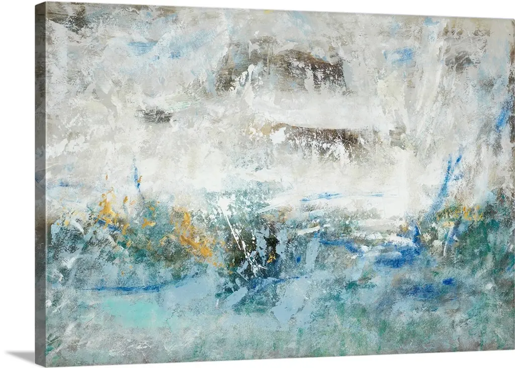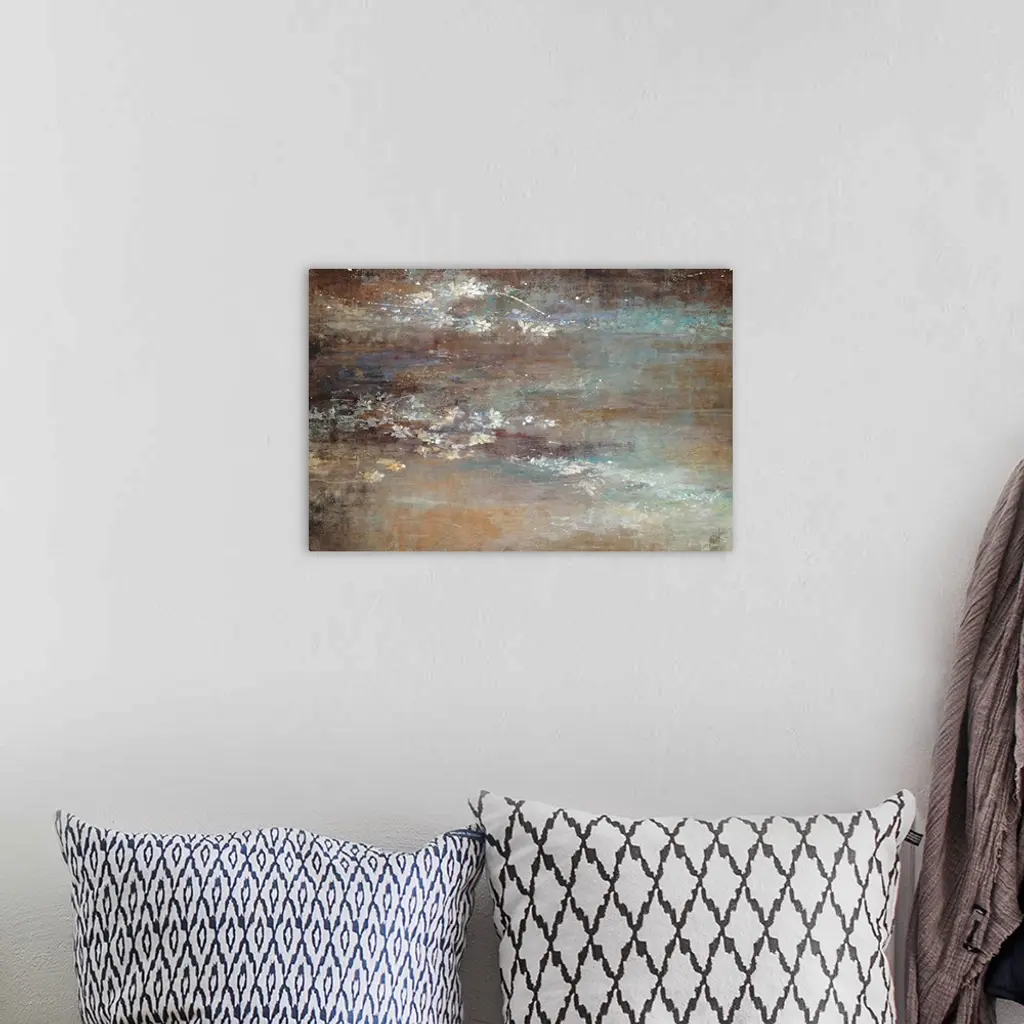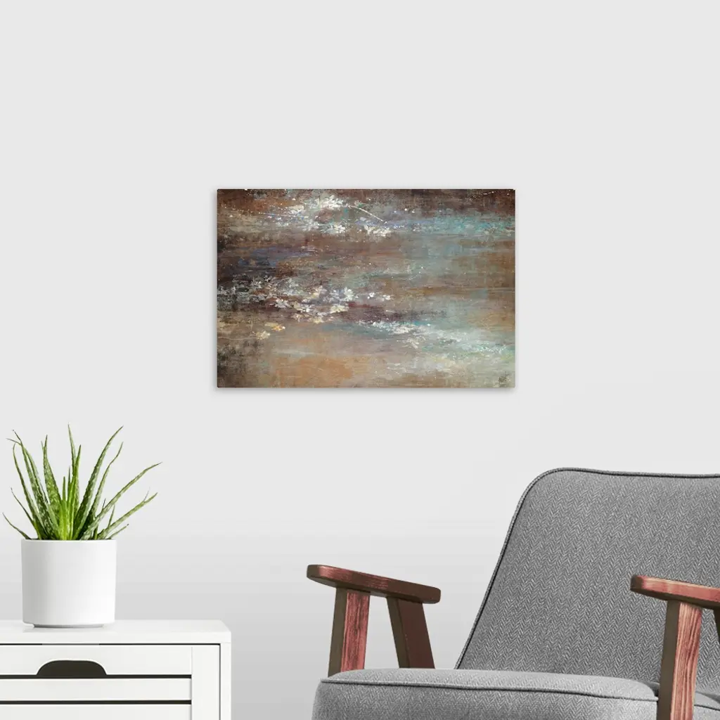 Abstract painting done in cool brown and gray tones with flecks of white dispersed throughout.