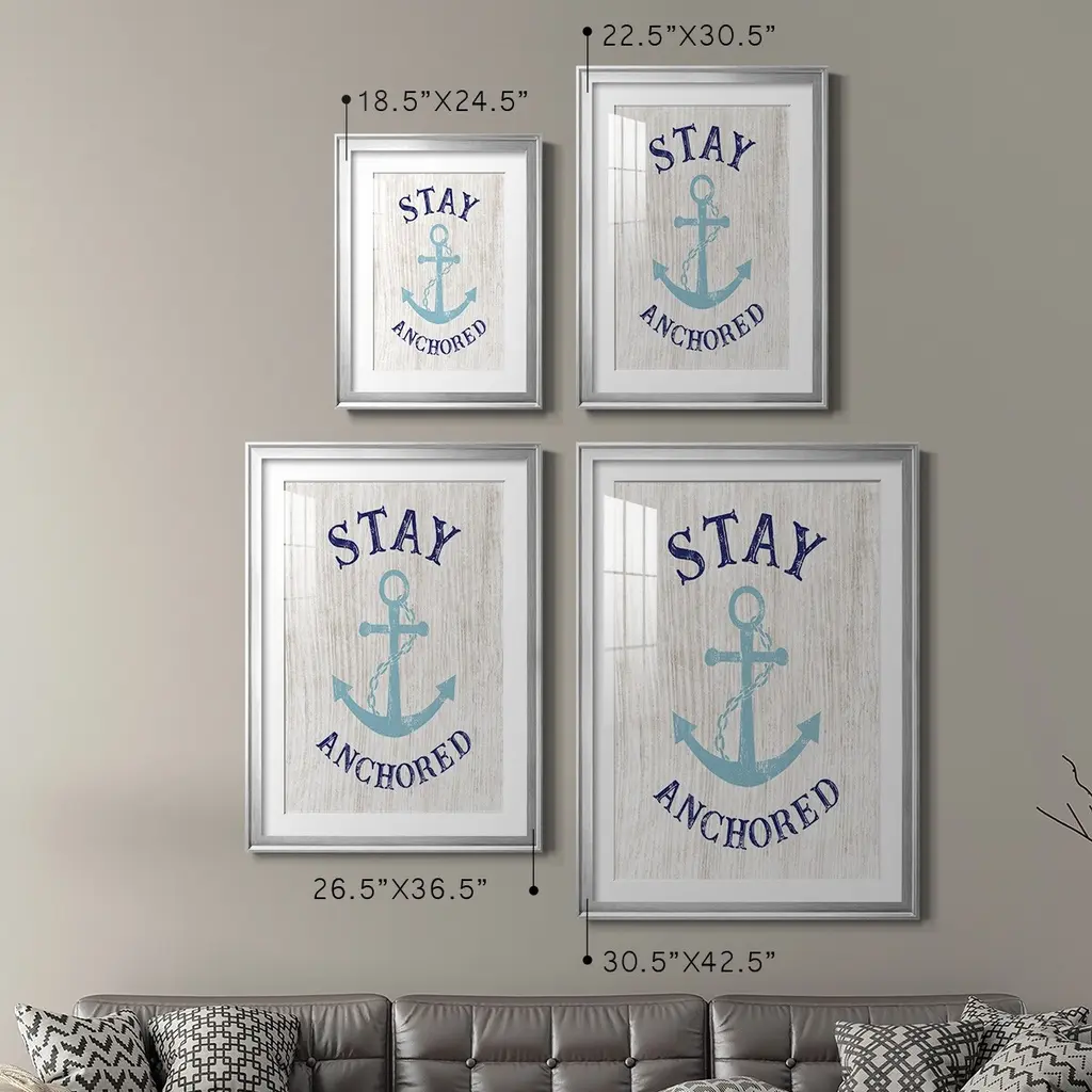 Stay Anchored Premium Framed Print - Ready to Hang A Premium Framed Print created to last. Framed in distressed wood and available in an array of sizes and colors Featuring a beveled a solid wood stretcher bar, each piece comes ready to hand 4 SIZES AVAILABLE 30.5''X42.5'' - Overall Size 26.5'X36.5'' - Overall Size 22.5''x30.5'' - Overall Size 18.5''x24.5'' - Overall Size Each piece is made to order. Each piece comes with hanging hardware. Made in the USA Ready to Hang Giclee Paper Print Acrylic Glass Beveled Matt Board