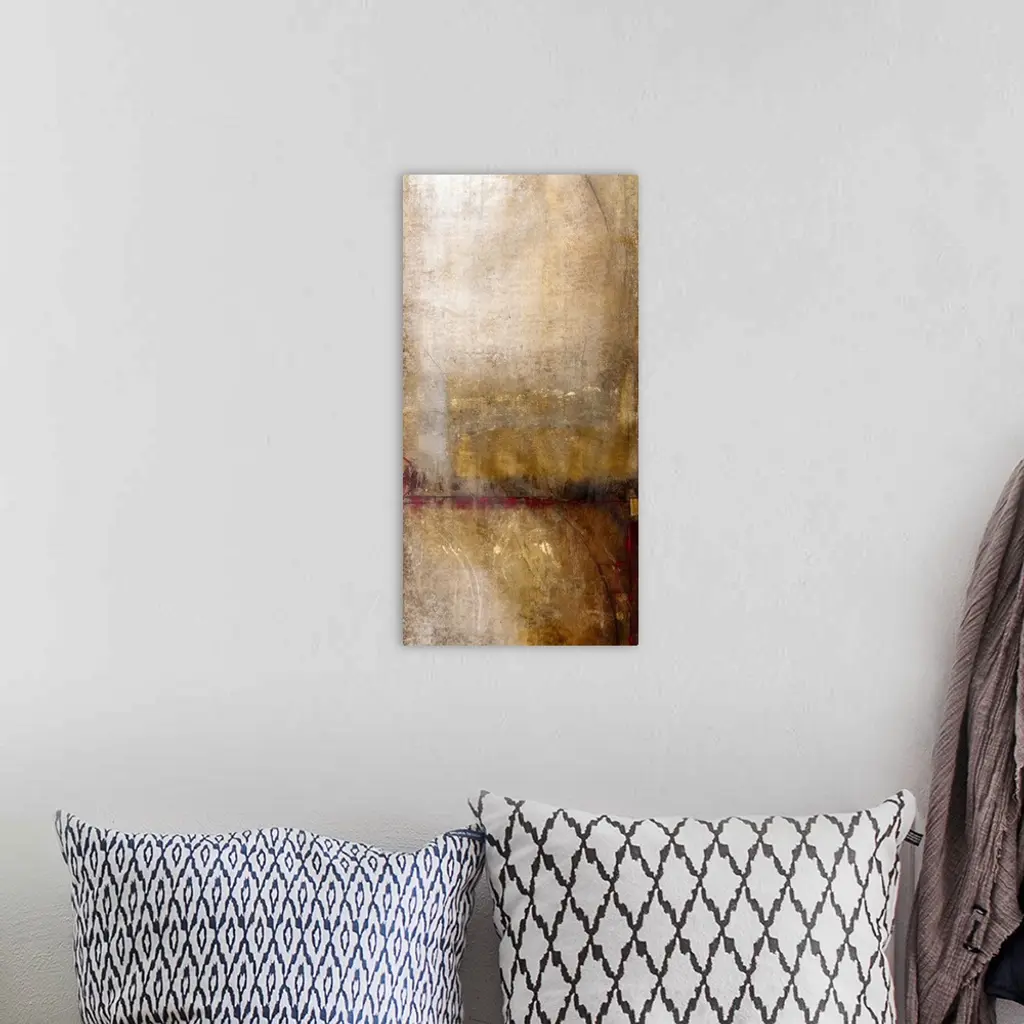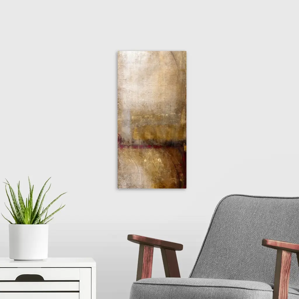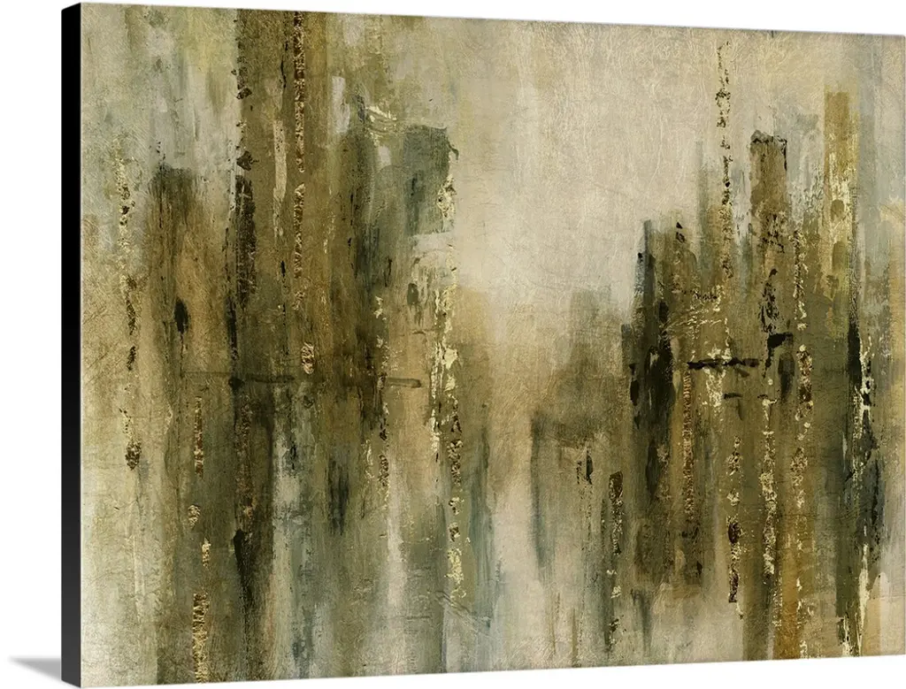 Abstract grunge painting in neutral tones with a variety of textures and brushstrokes.