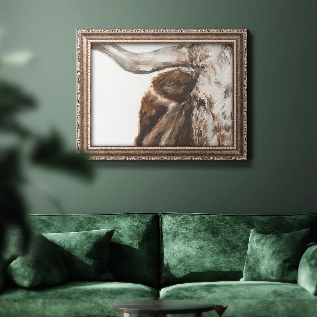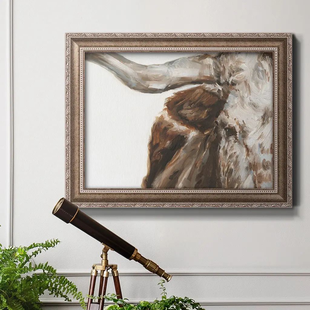 Steer Clear I Premium Framed Canvas- Ready to Hang A Premium Framed Canvas created to last. Framed in distressed wood and available in an array of sizes and colors Featuring a beveled a solid wood stretcher bar, each piece comes ready to hand 3 SIZES AVAILABLE 16''X20'' - Overall Size 18'X27'' - Overall Size 24''x36'' - Overall Size Each piece is made to order. Each piece comes with hanging hardware. Made in the USA Ready to Hang Giclee Paper Print Acrylic Glass Beveled Matt Board