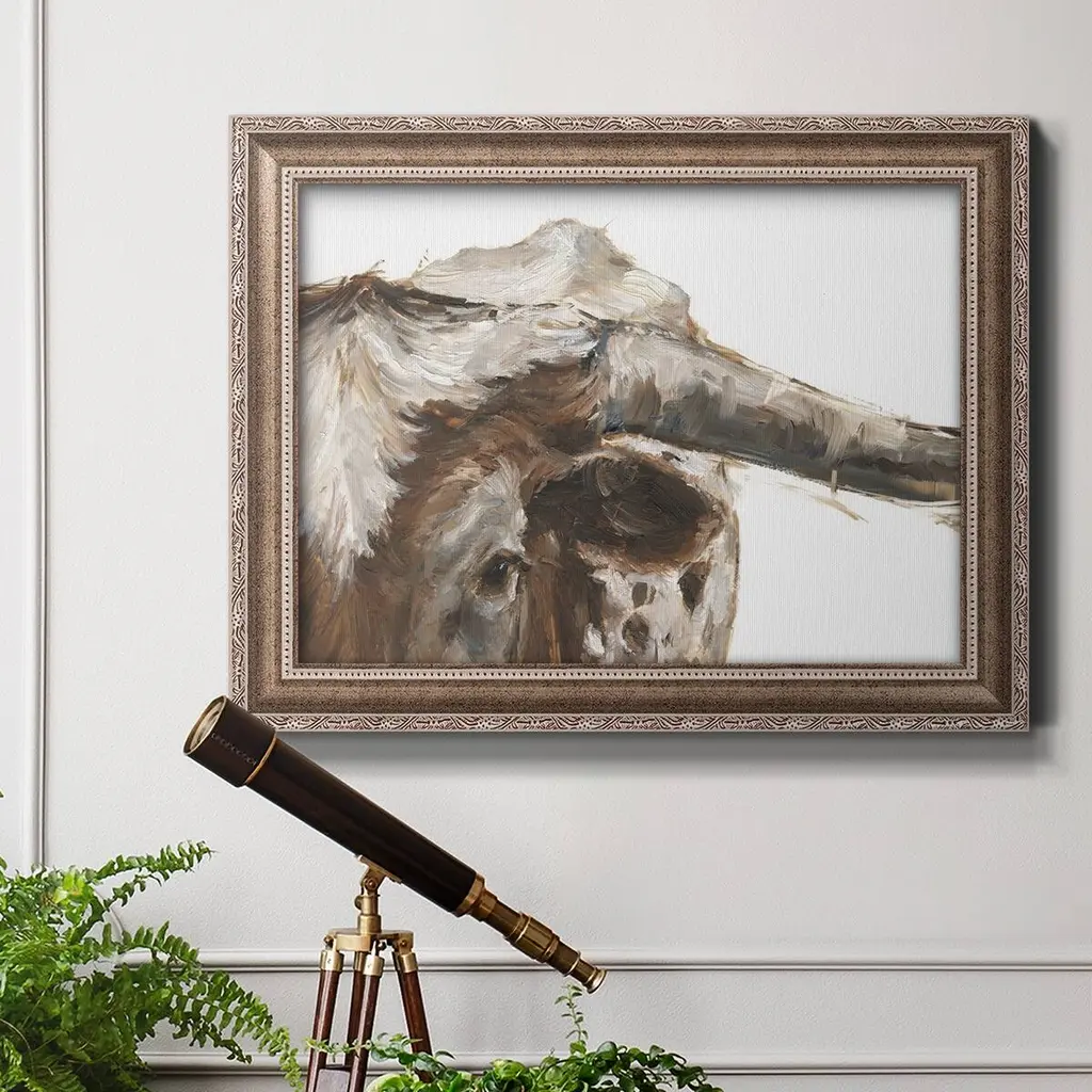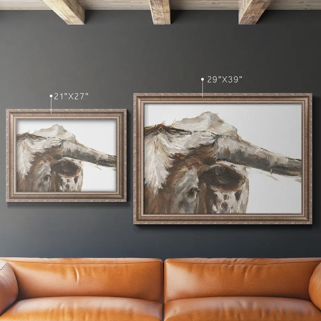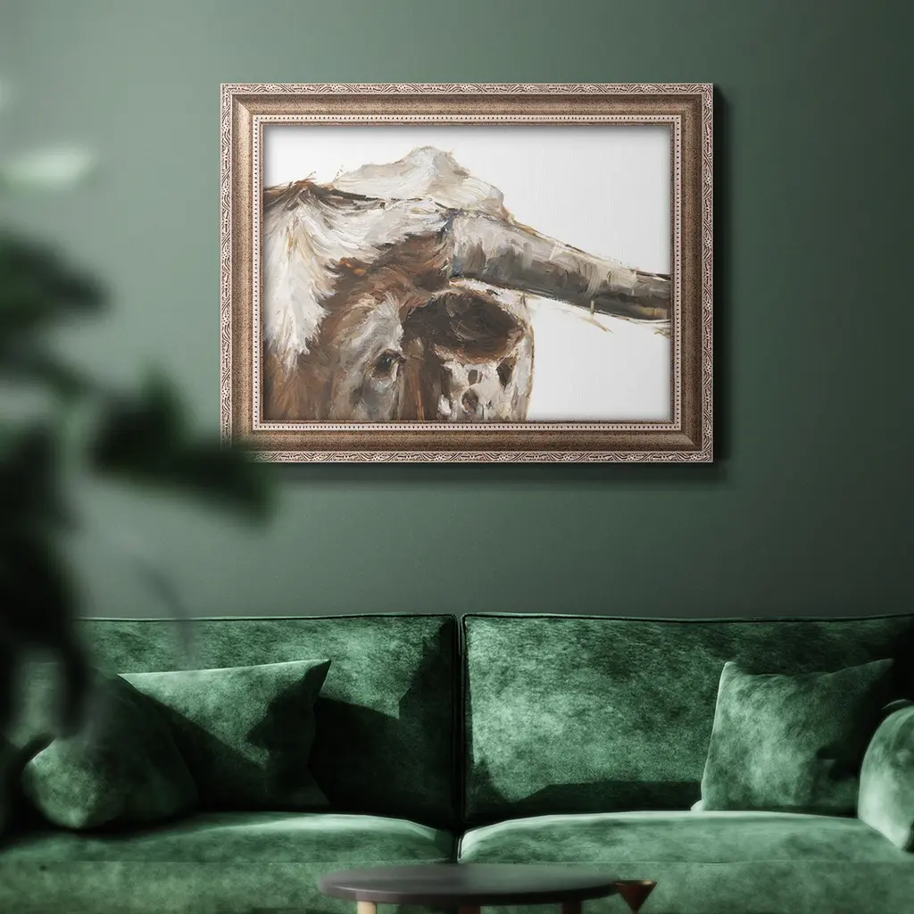Steer Clear II Premium Framed Canvas- Ready to Hang A Premium Framed Canvas created to last. Framed in distressed wood and available in an array of sizes and colors Featuring a beveled a solid wood stretcher bar, each piece comes ready to hand 3 SIZES AVAILABLE 16''X20'' - Overall Size 18'X27'' - Overall Size 24''x36'' - Overall Size Each piece is made to order. Each piece comes with hanging hardware. Made in the USA Ready to Hang Giclee Paper Print Acrylic Glass Beveled Matt Board
