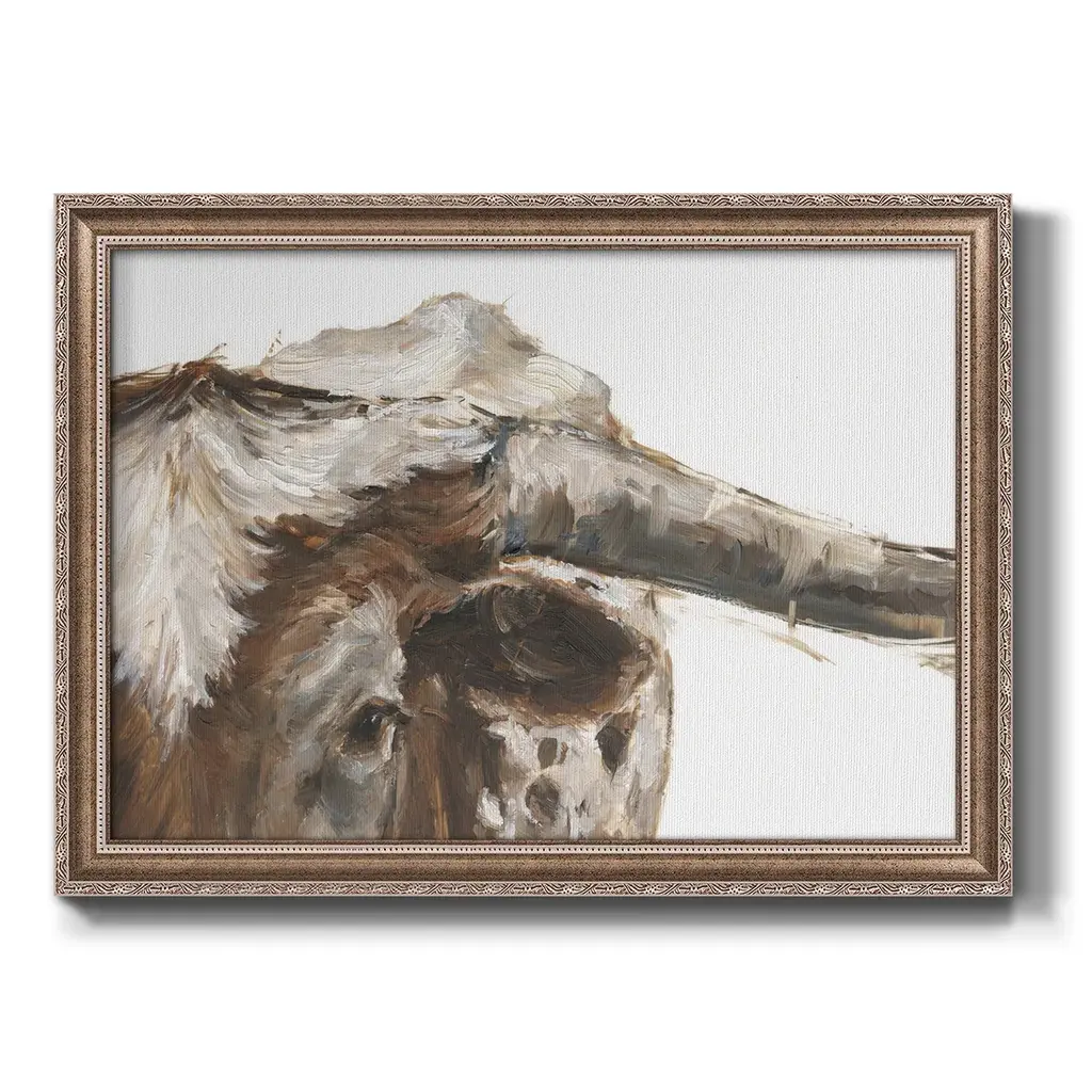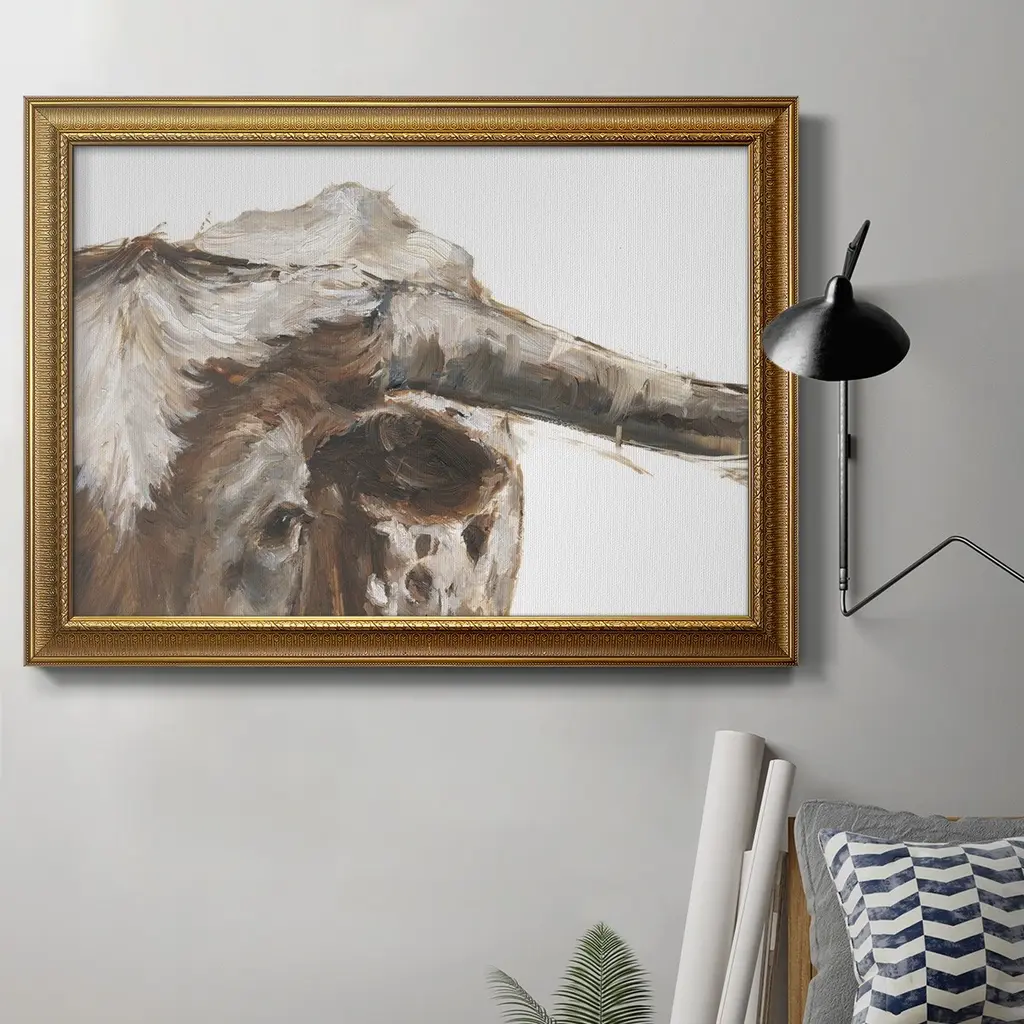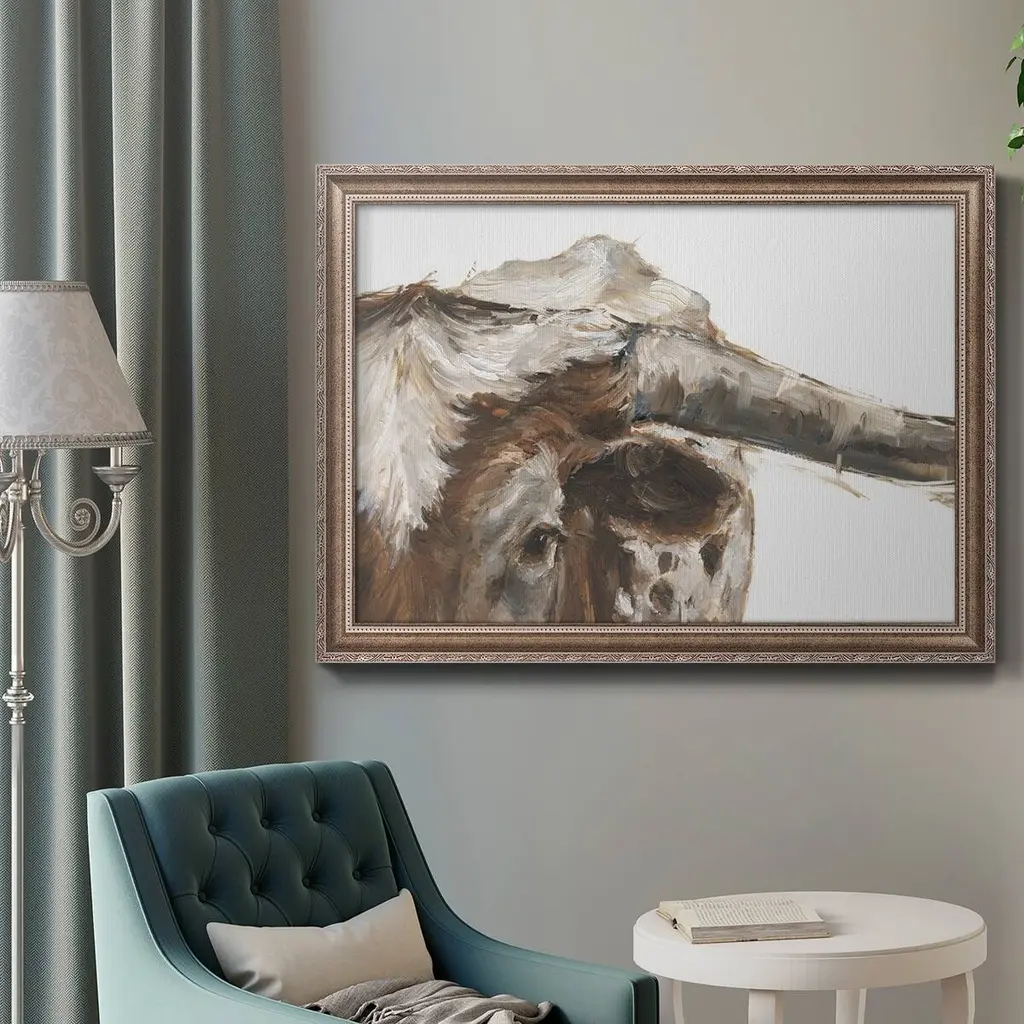 Steer Clear II Premium Framed Canvas- Ready to Hang A Premium Framed Canvas created to last. Framed in distressed wood and available in an array of sizes and colors Featuring a beveled a solid wood stretcher bar, each piece comes ready to hand 3 SIZES AVAILABLE 16''X20'' - Overall Size 18'X27'' - Overall Size 24''x36'' - Overall Size Each piece is made to order. Each piece comes with hanging hardware. Made in the USA Ready to Hang Giclee Paper Print Acrylic Glass Beveled Matt Board