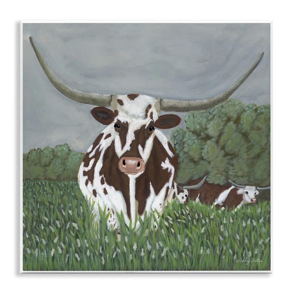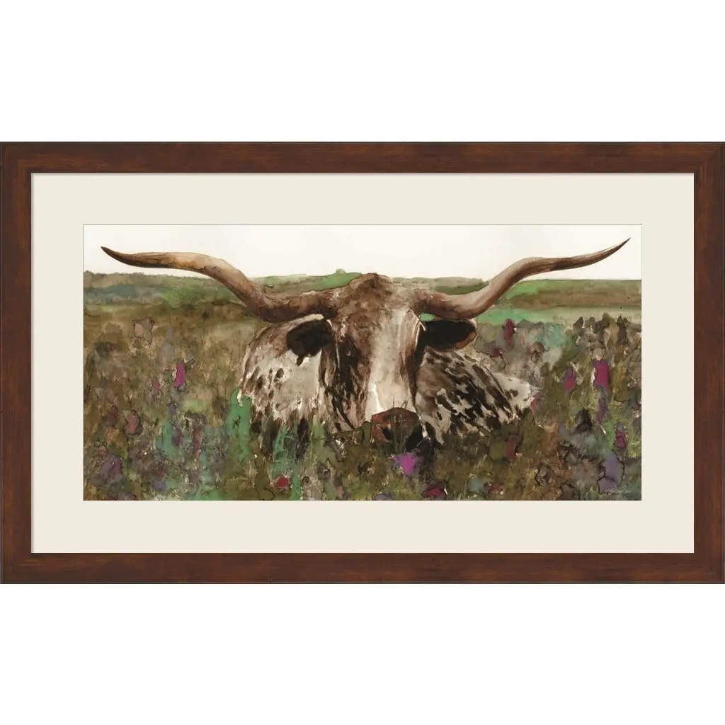 Texas Longhorn in Field by Stellar Design Studio is a high quality piece of framed artwork. The finished size of this piece is 30.5" X 18.75". It has a Slim Solid Pecan Brown Flat with Satin Finish frame, is single matted and finished with high quality Acrylic Plexiglass. 100% Satisfaction Guaranteed.