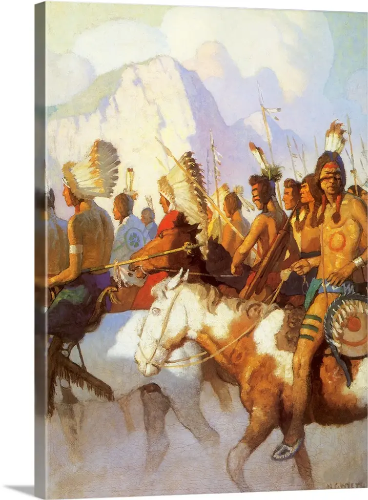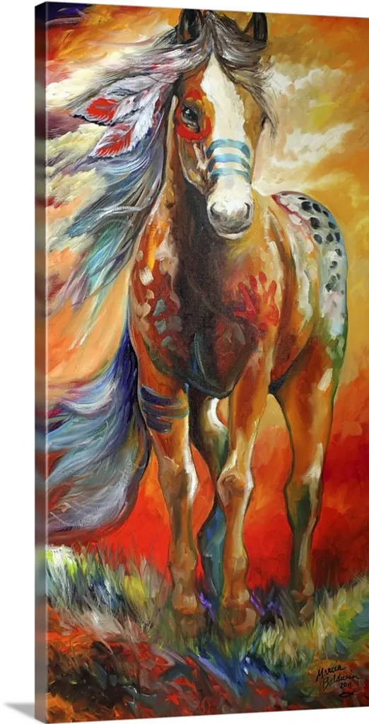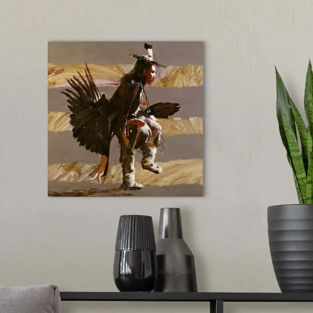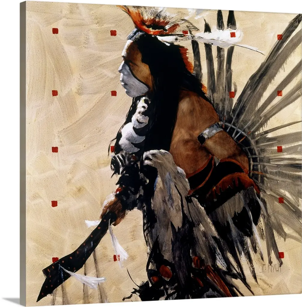 Contemporary western theme painting of a native american in traditional ceremonial dress.
