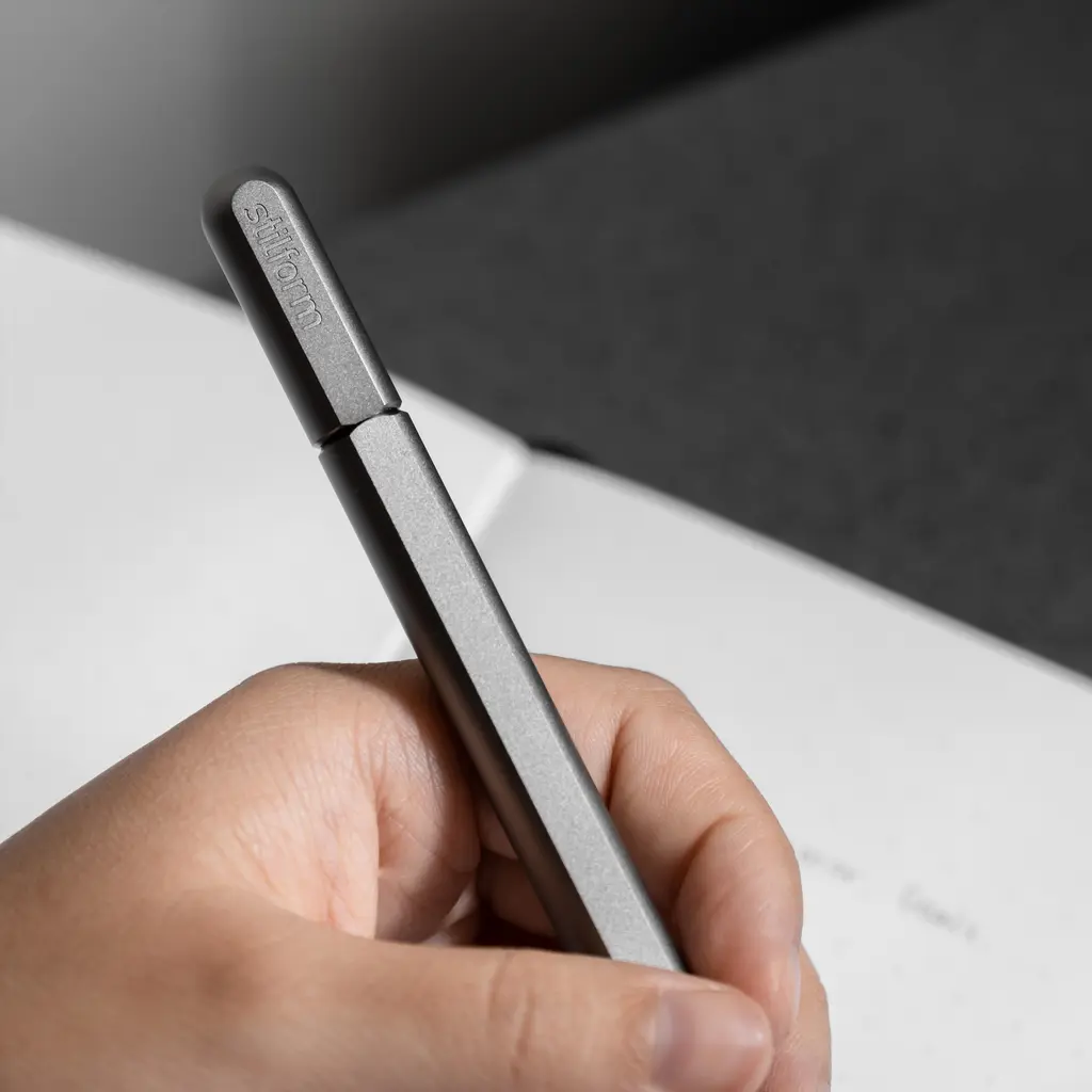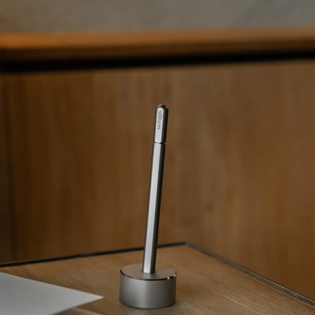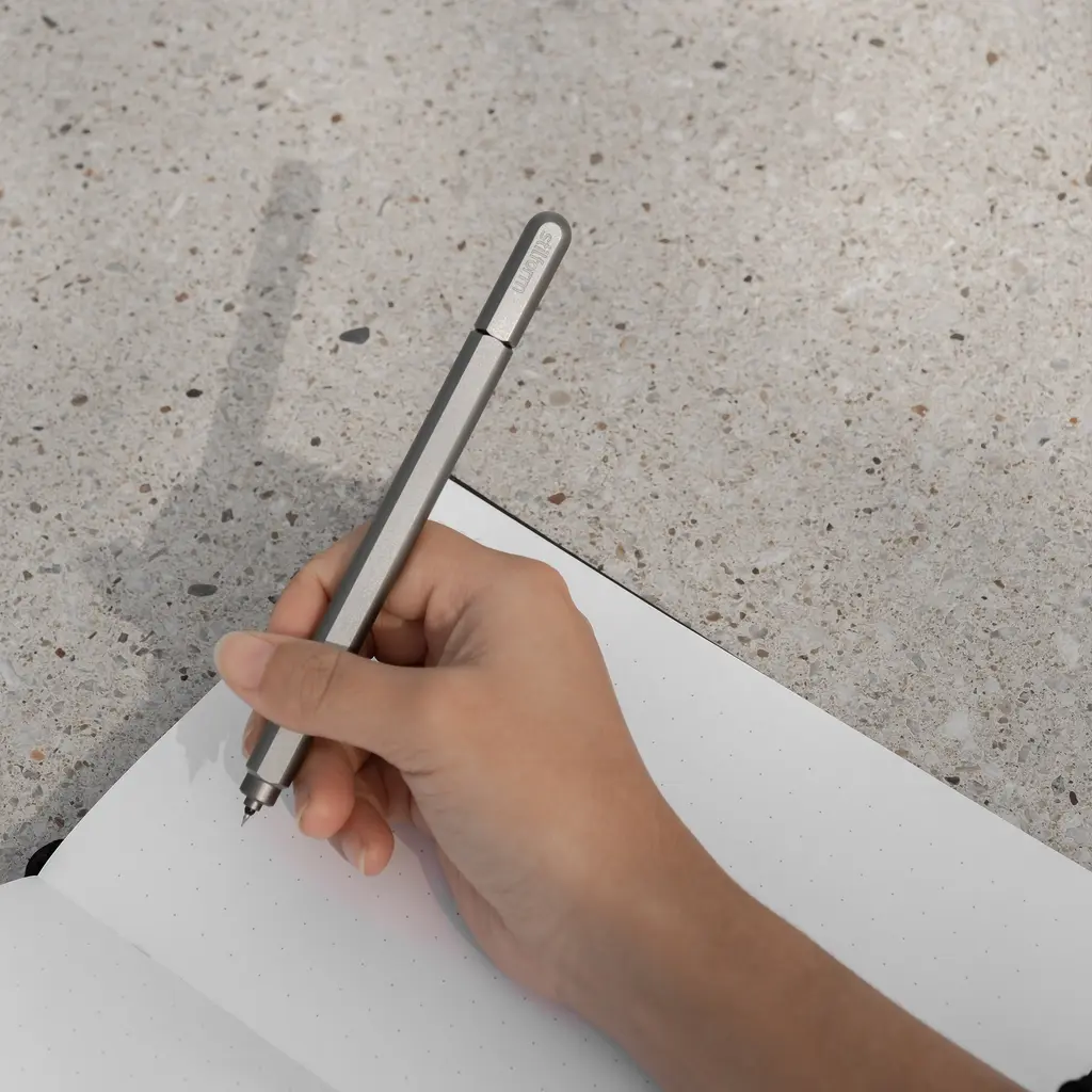 (Re)discover the joy of writing, sketching and planning with the beautifully designed Stilform Titanium Arc Gel Pen. Developed with creatives in mind, this pen features an elegant rounded body with anti-roll flat sides. The cap self-aligns with the body perfectly thanks to an innovative magnetic mechanism. Made to hold Pilot refills, this gel pen is ideal for illustrations, architectural plans, design sketches, writing, and more. This version is expertly crafted with precision machining techniques from high-grade titanium and features either a light matte or a dark DLC finish. Perfect as a gift, the Stilform Titanium Arc Gel Pen has received the iF Design Award and the Good Design award.