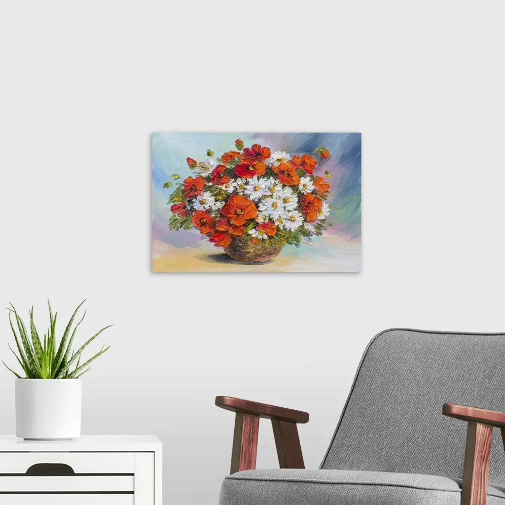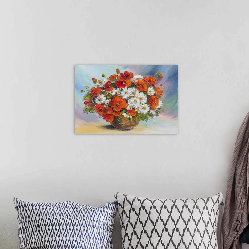Still Life, Abstract Watercolor Bouquet Of Poppies And Daisies