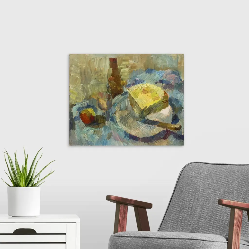 Still Life Bottle Cheese Knife Glass Of Apple On Canvas