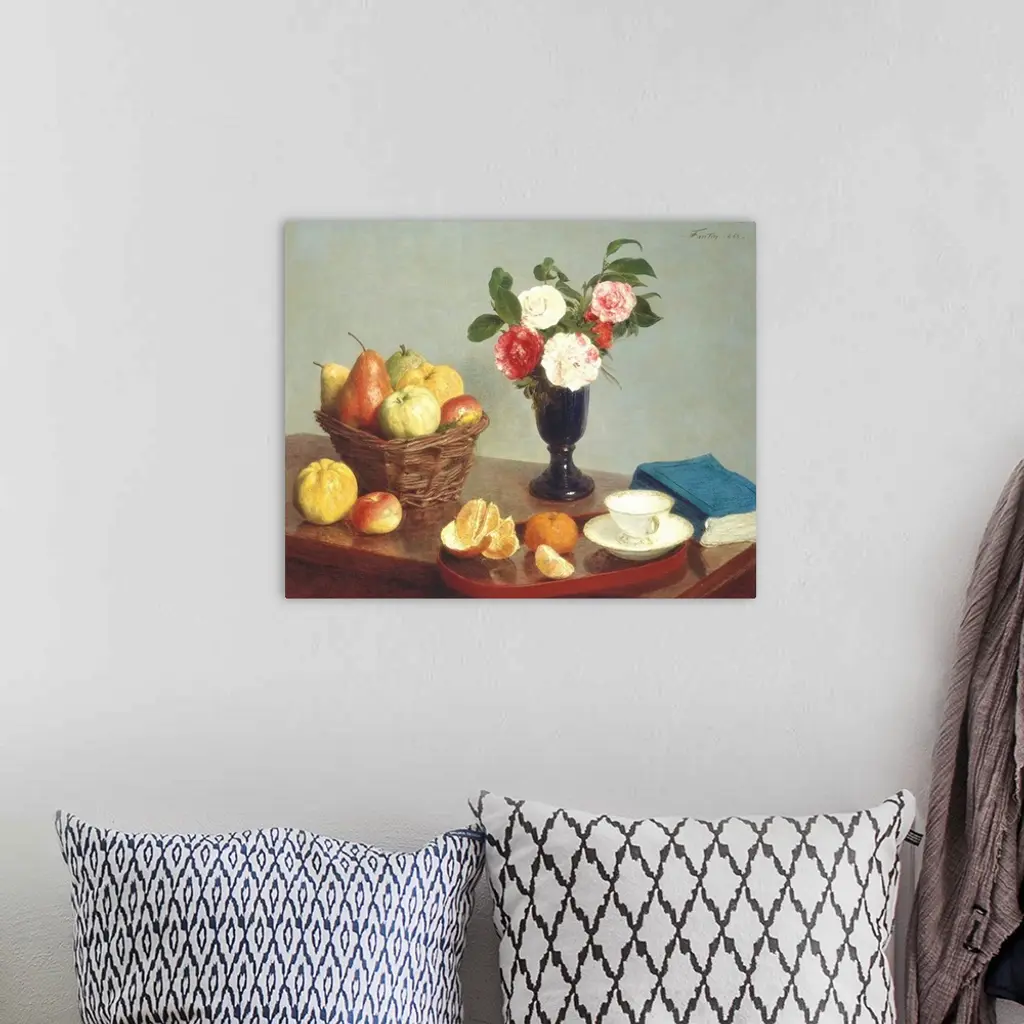 Still Life, by Henri Fantin-Latour, 1866, French painting, oil on canvas. He used the light palette of his impressionist associates, but worked in more finished, conservative style. This still life was accepted into the official Paris Salon of 1866