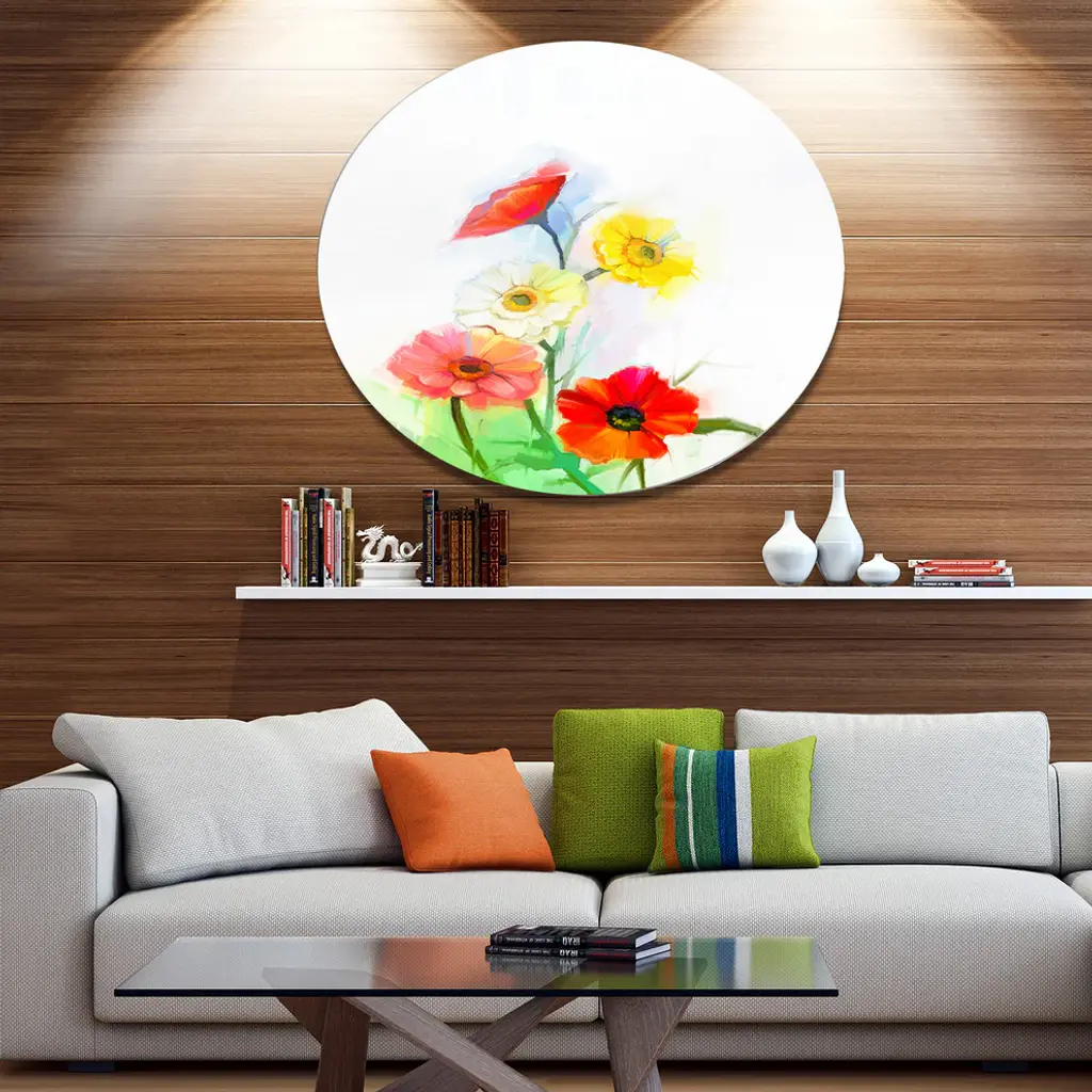 Bring Contemporary Abstraction to your home with this large Circle Metal wall art. This Still Life Colored Gerbera Flowers Metal Artwork makes it the focal point of any room or office. - White Gloss Coating ensures colors are extra vibrant with light reflection.- Aluminum grade Sheet Metal with 1 inch mounting frame on the back giving the illusion that the artwork is floating on the wall..- Mounting Brackets are included along with instructions.- High Quality Digital images are created directly into a glossy aluminum panel producing a stunning and captivating print into the glossy finish of the metal.- Water, Fire and Scratch resistant HD Aluminum panels.- Looks better than any photo paper and guaranteed to last at least 20 years- Easy to clean with a microfiber cloth. Colors are far superior to regular Canvas Art. - Easy to Hang
