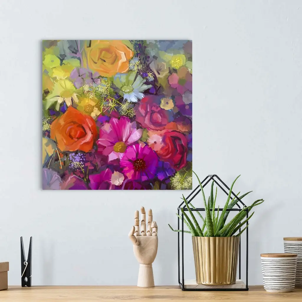 Still life of yellow and red color flowers. Originally an oil painting a bouquet of rose, daisy and gerbera flowers. Originally hand painted floral impressionist style.