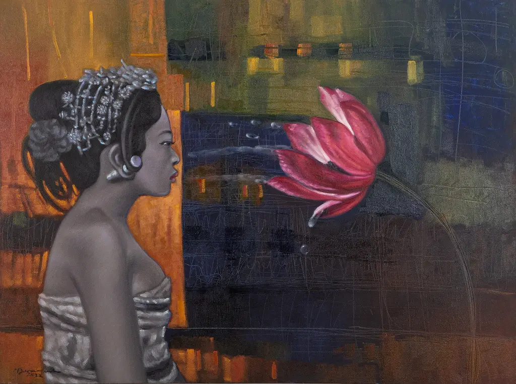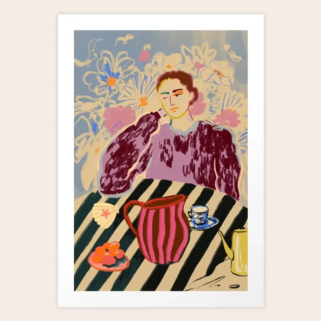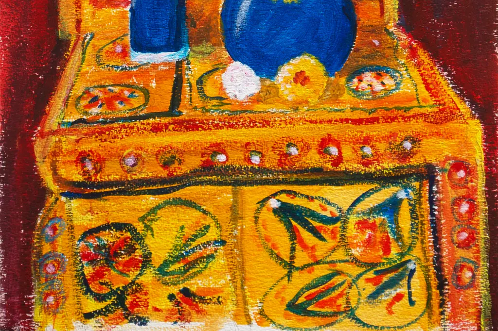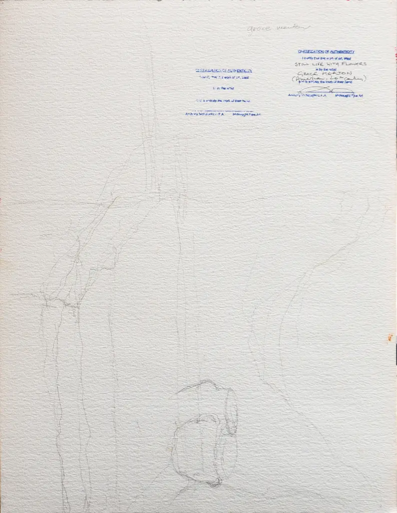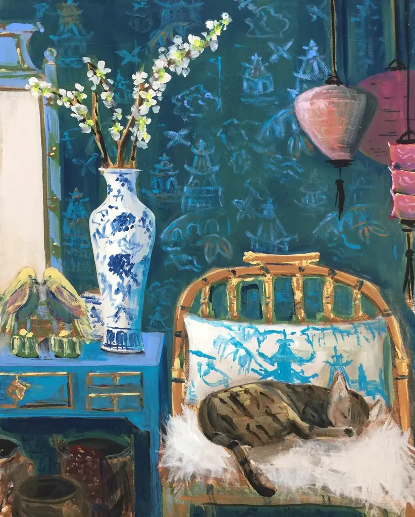 A vibrant post-impressionist study of marigolds in lapis-lazuli blue vases on a bright, floral embroidered chair. Stamped, verso, with certification of authenticity for Grace Merton (American, 20th century) and painted circa 1985.