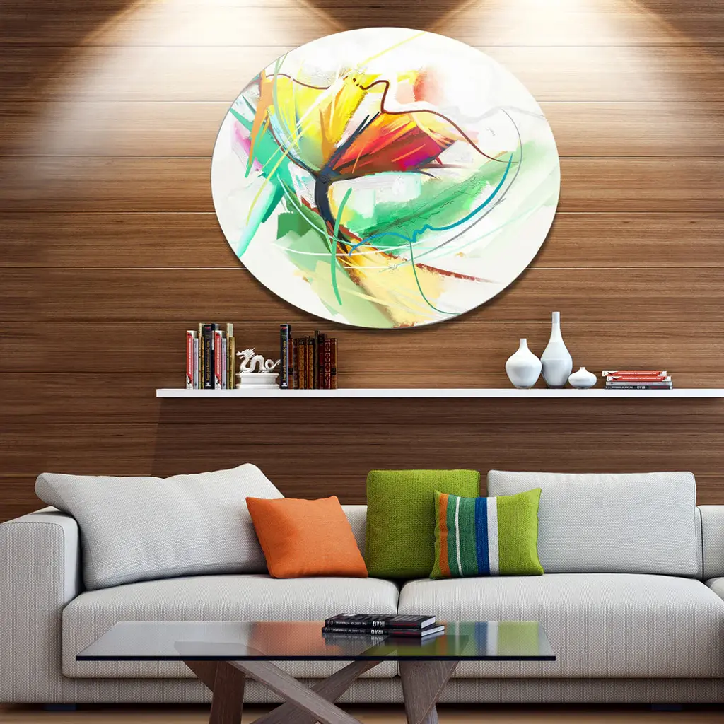 Bring Contemporary Abstraction to your home with this large Circle Metal wall art. This Still Life of Yellow Red Color Flower Metal Artwork makes it the focal point of any room or office. - White Gloss Coating ensures colors are extra vibrant with light reflection.- Aluminum grade Sheet Metal with 1 inch mounting frame on the back giving the illusion that the artwork is floating on the wall..- Mounting Brackets are included along with instructions.- High Quality Digital images are created directly into a glossy aluminum panel producing a stunning and captivating print into the glossy finish of the metal.- Water, Fire and Scratch resistant HD Aluminum panels.- Looks better than any photo paper and guaranteed to last at least 20 years- Easy to clean with a microfiber cloth. Colors are far superior to regular Canvas Art. - Easy to Hang