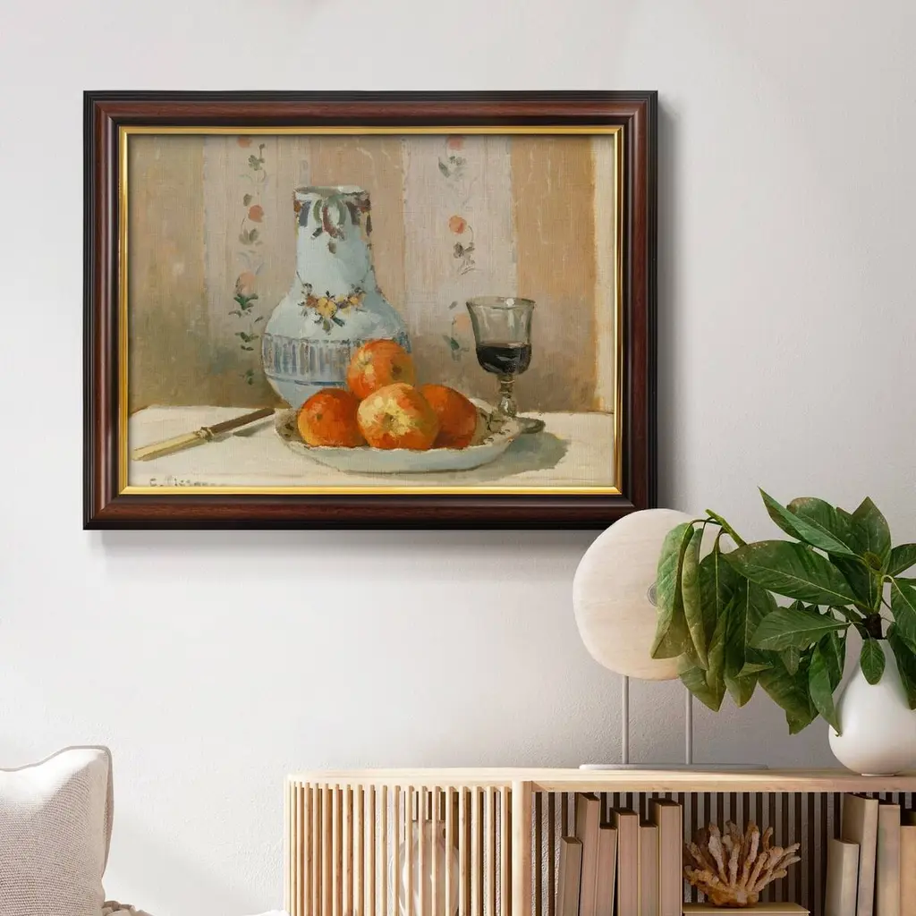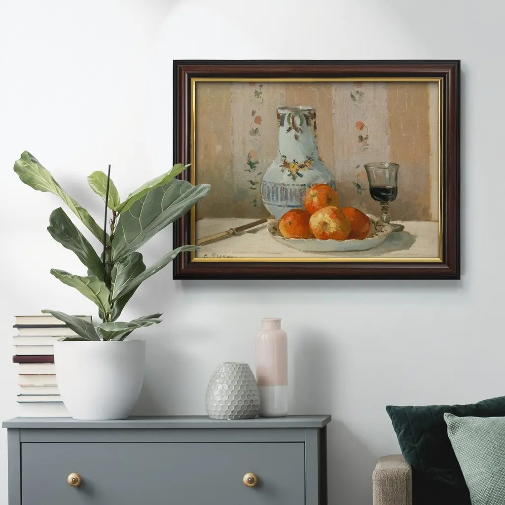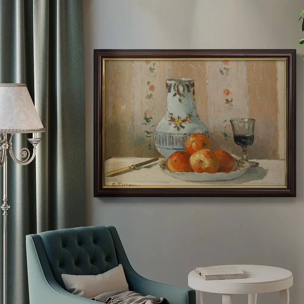 Still Life with Apples and Pitcher Premium Framed Canvas- Ready to Hang A Premium Framed Canvas created to last. Framed in distressed wood and available in an array of sizes and colors Featuring a beveled a solid wood stretcher bar, each piece comes ready to hand 3 SIZES AVAILABLE 16''X20'' - Overall Size 18'X27'' - Overall Size 24''x36'' - Overall Size Each piece is made to order. Each piece comes with hanging hardware. Made in the USA Ready to Hang Giclee Paper Print Acrylic Glass Beveled Matt Board