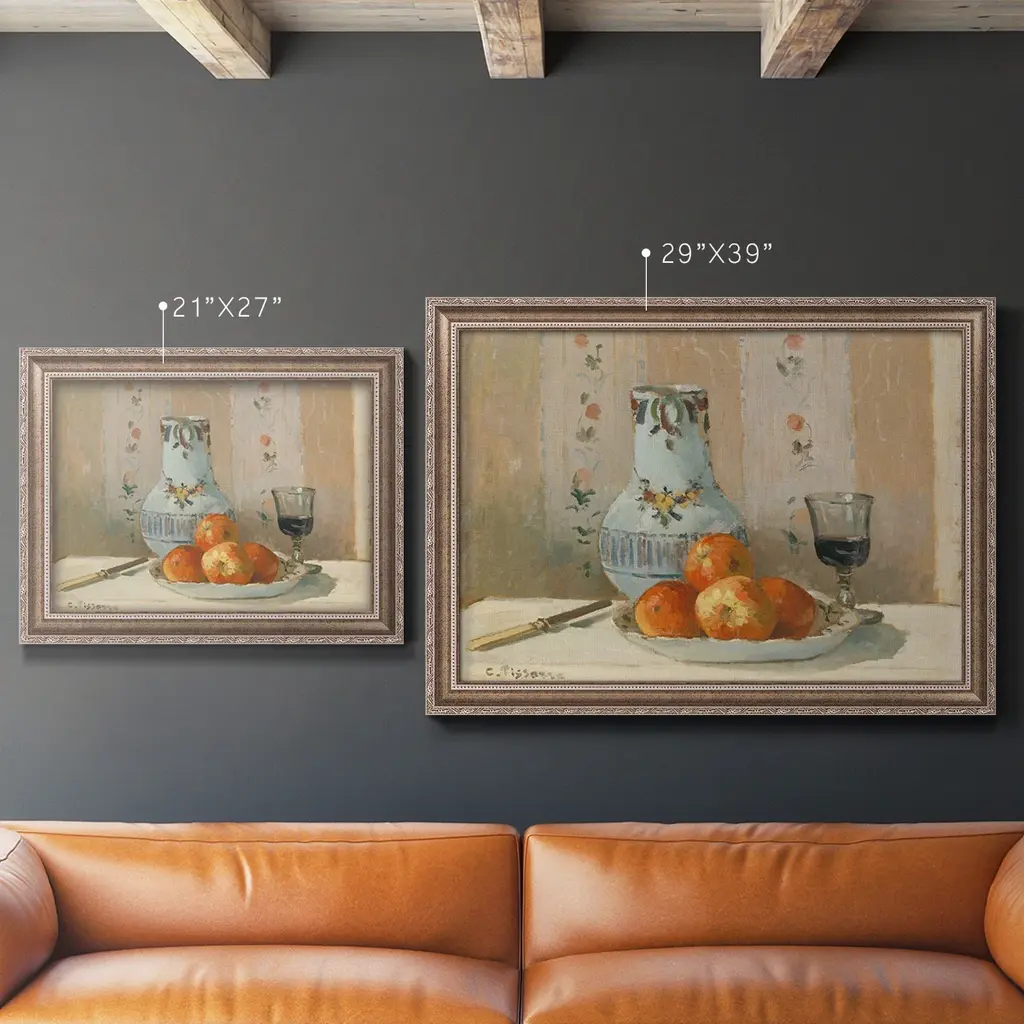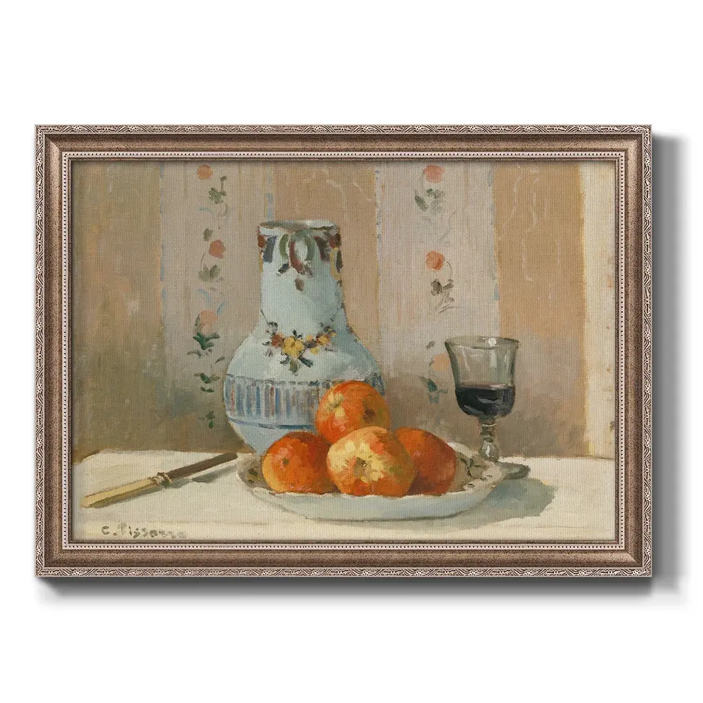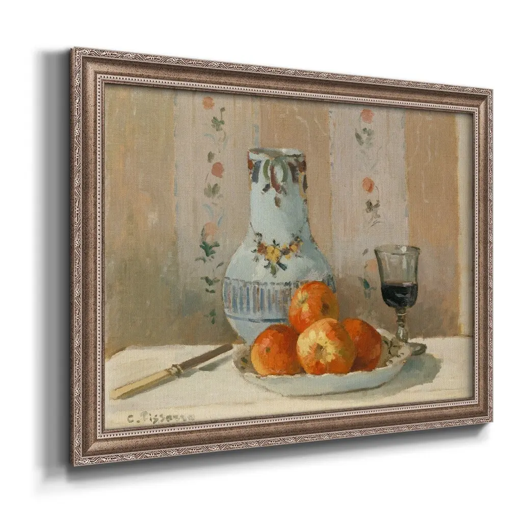 Still Life with Apples and Pitcher Premium Framed Canvas- Ready to Hang A Premium Framed Canvas created to last. Framed in distressed wood and available in an array of sizes and colors Featuring a beveled a solid wood stretcher bar, each piece comes ready to hand 3 SIZES AVAILABLE 16''X20'' - Overall Size 18'X27'' - Overall Size 24''x36'' - Overall Size Each piece is made to order. Each piece comes with hanging hardware. Made in the USA Ready to Hang Giclee Paper Print Acrylic Glass Beveled Matt Board