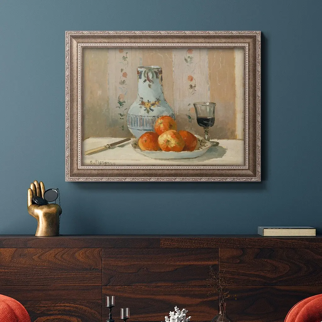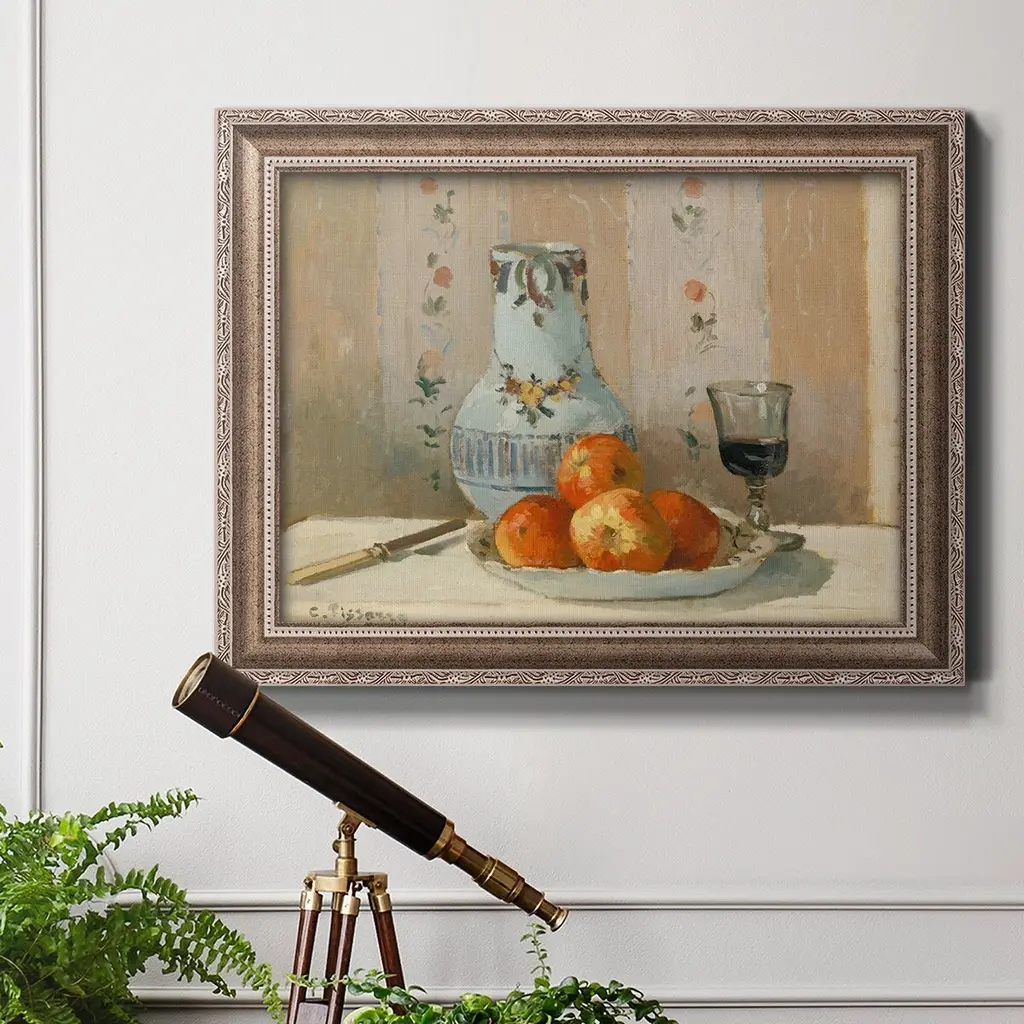 Still Life with Apples and Pitcher Premium Framed Canvas- Ready to Hang A Premium Framed Canvas created to last. Framed in distressed wood and available in an array of sizes and colors Featuring a beveled a solid wood stretcher bar, each piece comes ready to hand 3 SIZES AVAILABLE 16''X20'' - Overall Size 18'X27'' - Overall Size 24''x36'' - Overall Size Each piece is made to order. Each piece comes with hanging hardware. Made in the USA Ready to Hang Giclee Paper Print Acrylic Glass Beveled Matt Board
